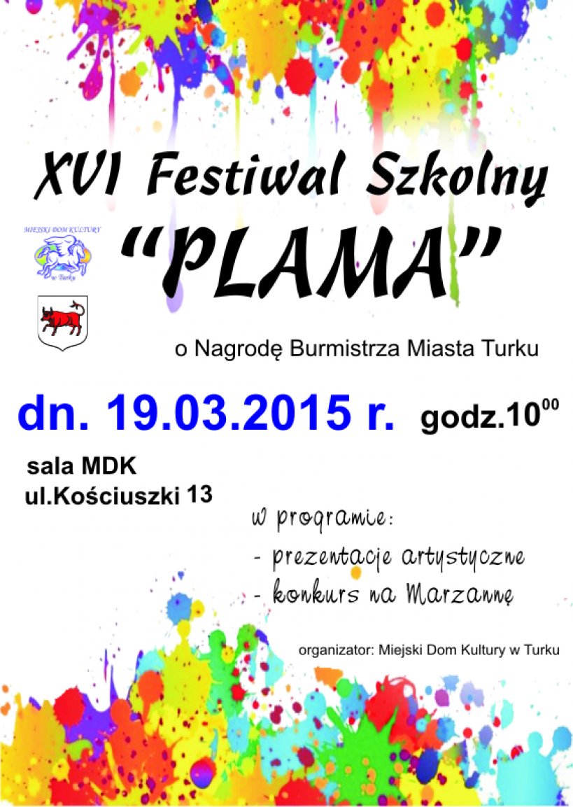 Miejski Dom Kultury w Turku zaprasza na XVI Festiwal Szkolny "PLAMA", Który odbędzie się dnia 19.03.2015 o godz. 10.00. Festiwalowi towarzyszy konkurs na Najoryginalniejszą Marzannę wykonaną przez uczniów szkół biorących udział w festiwalu. Festiwal odbywał się będzie w sali MDK.