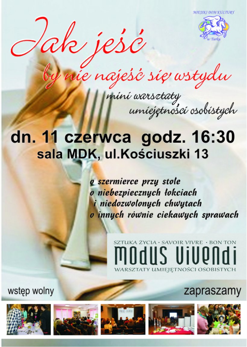 Zapraszamy Państwa na kolejne warsztaty umiejętności osobistych pt:” Jak jeść by nie najeść się wstydu”. Prowadzącą tak jak poprzednio będzie Małgorzata Kwiecińska. Tym razem porozmawiamy o szermierce przy stole, o niebezpiecznych łokciach i niedozwolonych chwytach oraz innych równie ciekawych sprawach. Zapraszamy 11 czerwca , godz. 16:30 MDK Turek.