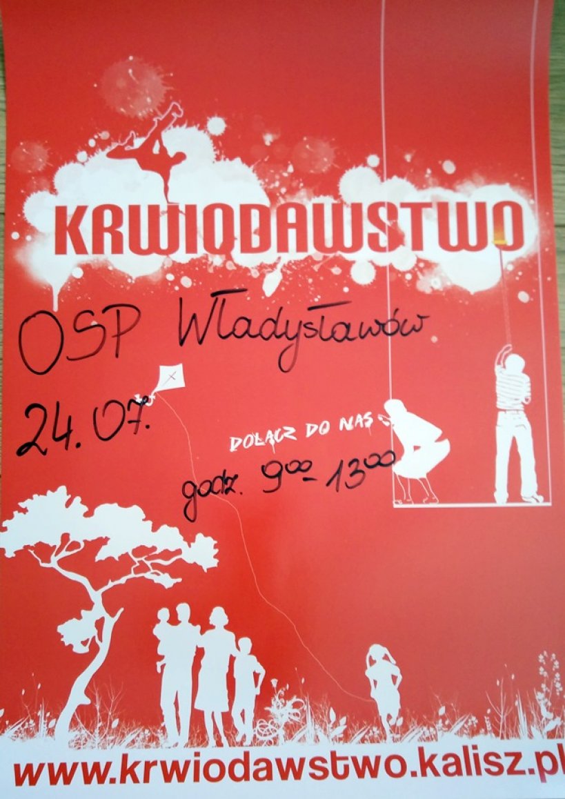 Ochotnicza Straż Pożarna przy współpracy z Regionalnym Centrum Krwiodawstwa i Krwiolecznictwa w Kaliszu organizuje przyjazd Mobilnego Punktu Poboru Krwi do Władysławowa. Wyznaczony termin przyjazdu to niedziela 24 lipca.