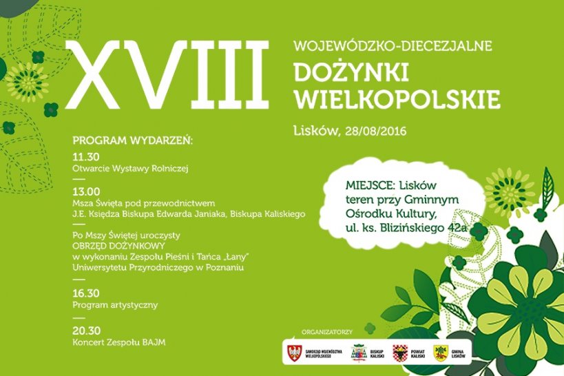 Wielkopolskie Dożynki Wojewódzko-Diecezjalne odbywają się bardzo blisko naszego powiatu, praktycznie tuż „za miedzą”. Te wyjątkowe obchody będzie można śledzić, udając się w niedzielę 28 sierpnia do położonego nieopodal gmin Malanów i Kawęczyn Liskowa. Wydarzenie uświetni koncert jednego z najpopularniejszych polskich zespołów – Bajmu.