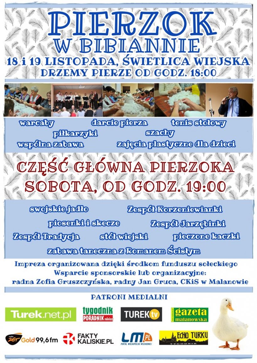 Pierzok to impreza integracyjna, kultywująca tradycyjne darcie pierza i szeroko pojęty wiejski folklor, organizowana od kilku lat przez społeczność wsi Bibianna. Dwudniowa impreza odbędzie się w dwa wieczory 18 i 19 listopada.