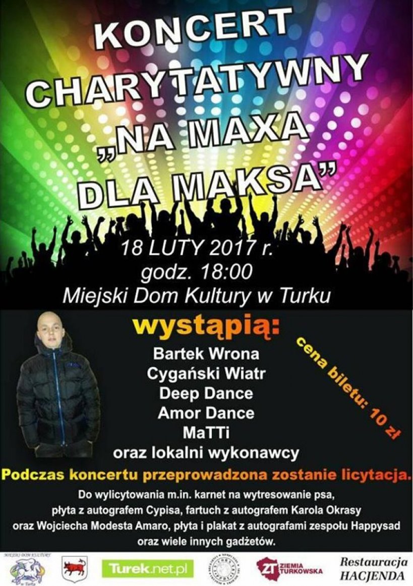 Już 18 lutego o godz. 18:00, w Miejskim Domu Kultury w Turku, odbędzie się wspaniały koncert charytatywny dla chorego na białaczkę Maksa. Przyjdź i Ty. Wesprzyj Maksa wykupując cegiełkę za kwotę 10 zł oraz weź udział w licytacji!