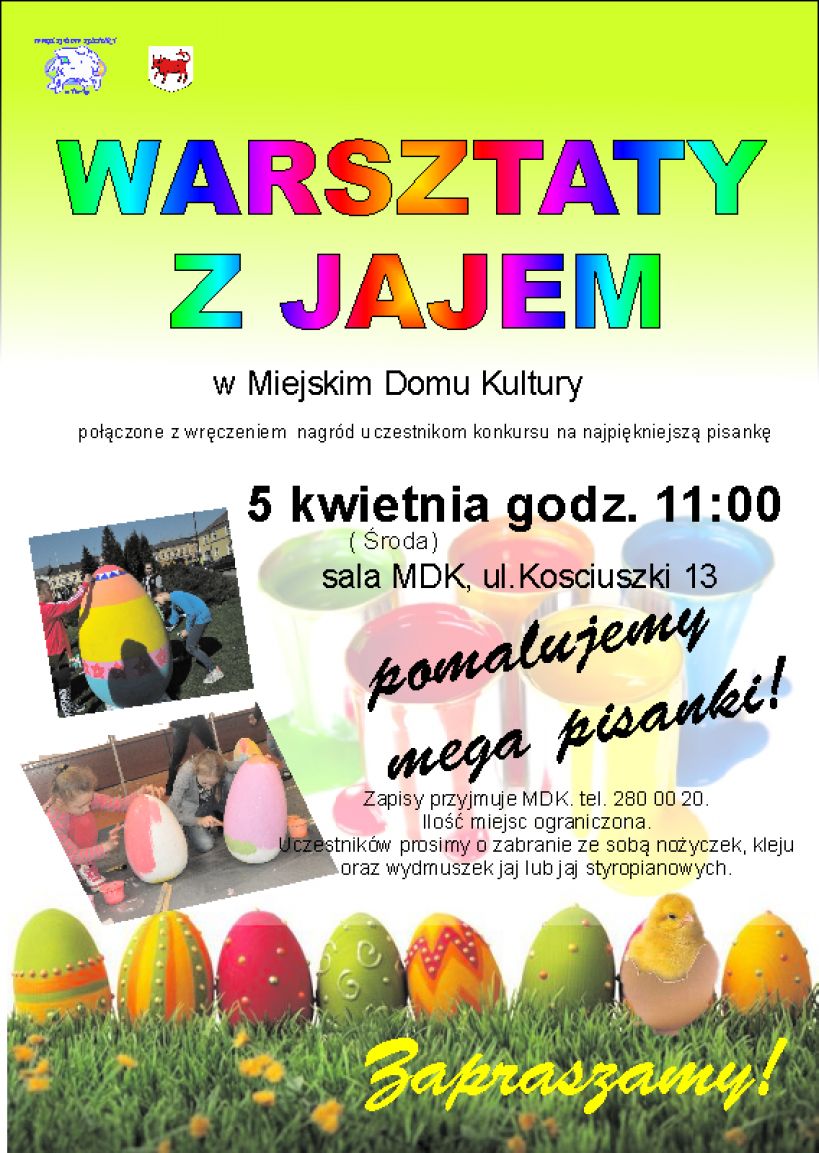 MDK Turek zaprasza 5 kwietnia na Wielkanocne warsztaty plastyczne ” Z JAJEM”. Odbędą się one w MDK w godz. 11.00 – 14.00. Zapisy tel. 280 00 20. Ilość miejsc ograniczona. Warsztatom towarzyszy konkurs na Najpiękniejszą pisankę wielkanocną. Regulamin do pobrania w zakładce weź udział-konkursy.
