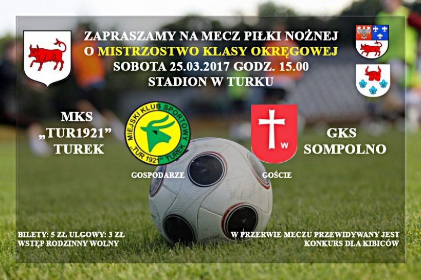 Zapraszamy na kolejny mecz piłki nożnej w ramach walki o mistrzostwo klasy okręgowej. W sobotę 25 marca na stadionie 1000-lecia w Turku zmierzą się MKS Tur 1921 Turek i GKS Sompolno. Początek spotkania o godz. 15:00. W przerwie meczu przewidywany jest konkurs dla kibiców. Cena biletu to jedyne 5 zł, ulgowy 3 zł. Wstęp rodzinny – wolny.