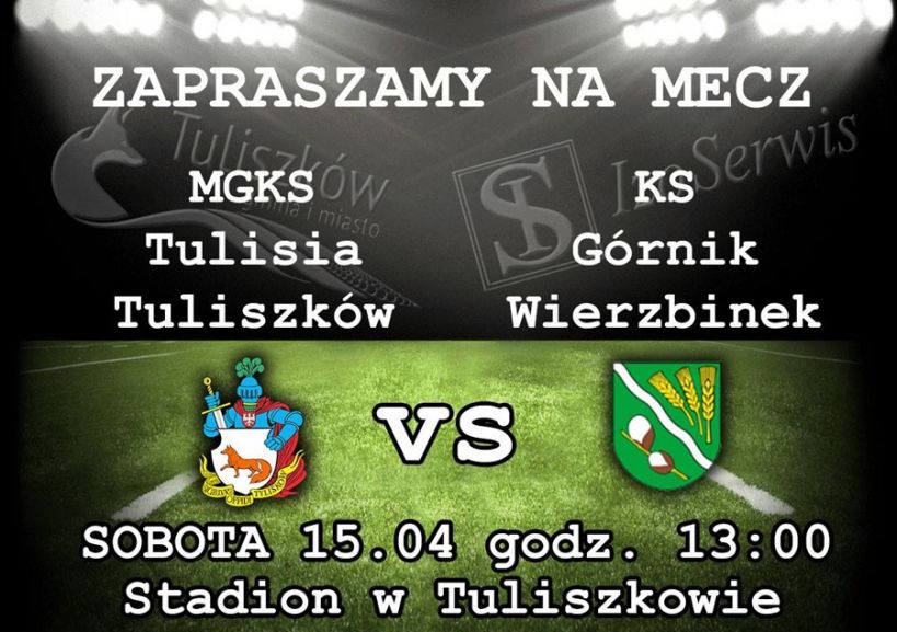 Zapraszamy na kolejny mecz piłki nożnej w ramach rozgrywek konińskiej A-klasy. W sobotę 15 kwietnia na stadionie w Tuliszkowie zmierzą się MGKS Tulisia Tuliszków i KS Górnik Wierzbinek. Początek spotkania o godz. 13:00.