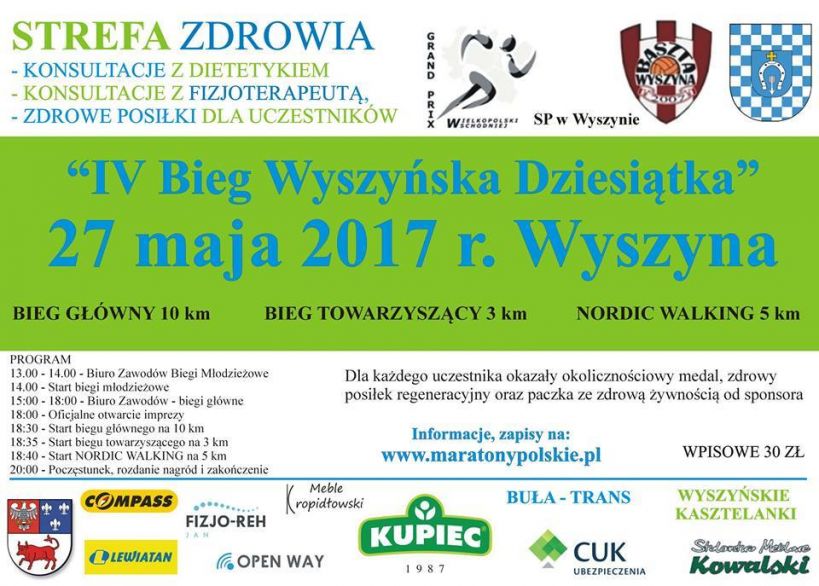 Czwarta już edycja imprezy dla miłośników biegów długodystansowych - Wyszyńskiej Dziesiątki - odbędzie się w sobotę 27 maja. Do udziału w zmaganiach zachęcają: Klub Baszta Wyszyna, Urząd Gminy Władysławów, Szkoła Podstawowa w Wyszynie, OSP Wyszyna oraz Starostwo Powiatowe w Turku.