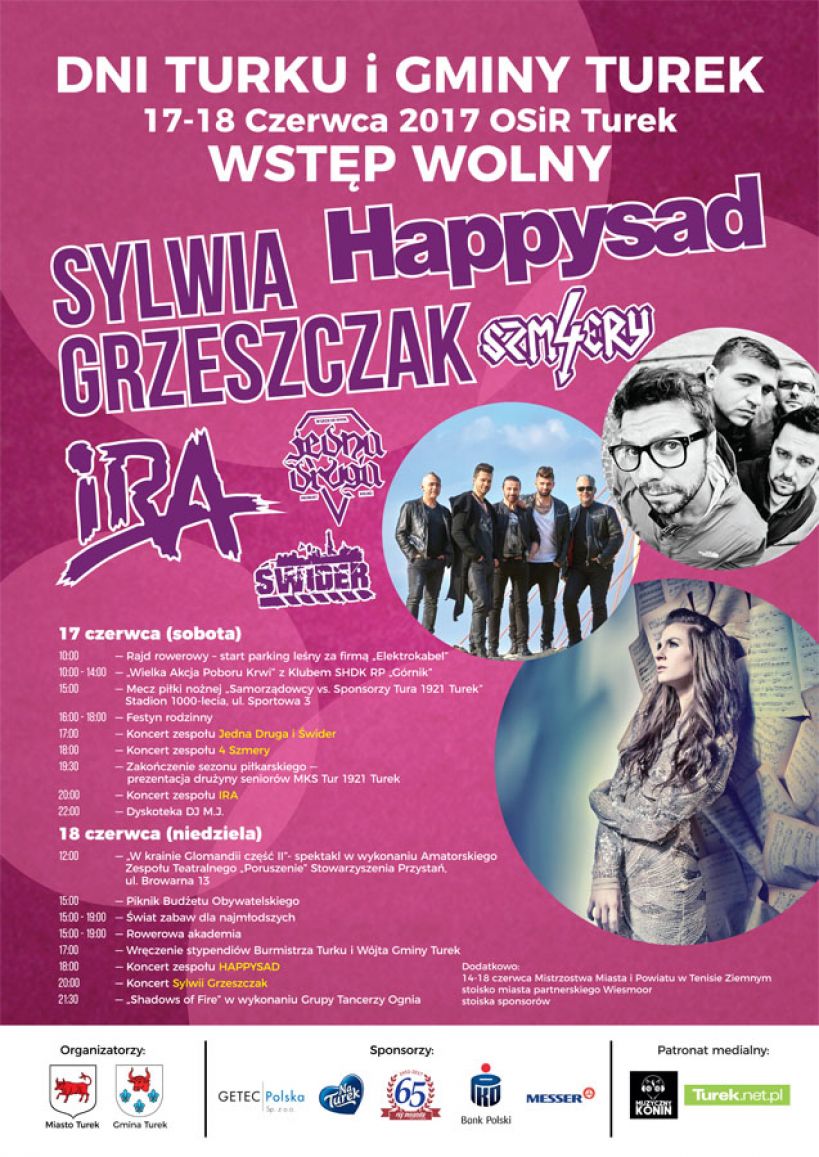 Sylwia Grzeszczak i zespół IRA będą gwiazdami tegorocznych Dni Turku i Gminy Turek. Coroczna impreza dla mieszkańców Turku i gminy Turek odbywać się będzie w weekend po Święcie Bożego Ciała, tj. w dniach 17 i 18 czerwca 2017 r. Dla mieszkańców organizatorzy przygotowują jeszcze koncerty innych zespołów polskiej sceny muzycznej. Poza IRĄ i Grzeszczak, będzie można bawić się na koncercie grupy Happysad, grającą mieszkankę rocka alternatywnego i gitarowego. Na pewno wielu fanów ucieszy się z koncertu zespołu „4 Szmery”, uznawanego za najlepszy coverband zespołu AC/DC.