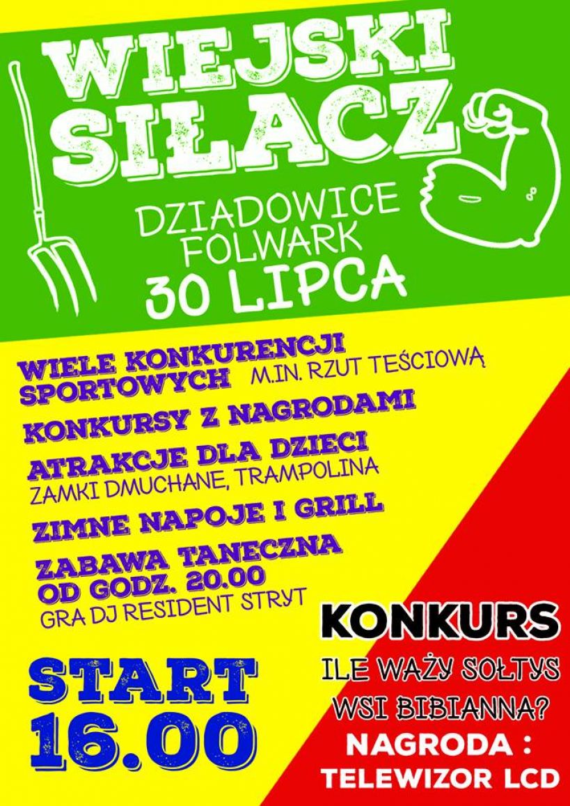Podczas festynu zostaną rozegrane konkurencje siłowe oraz konkurencje z elementami lekkoatletycznymi. Zawody będą różniły się od klasycznych tym, że nacechowane będą humorem i oprawione w klimat wiejkiego folkloru - jedną z dyscyplin będzie rzut teściową! "Wiejski siłacz" to nie tylko rywalizacja sportowa - w trakcie wydarzenia zostanie przeprowadzony konkurs "Ile waży sołtys wsi Bibianna?!" - nagrodą w tym konkursie będzie telewizor.