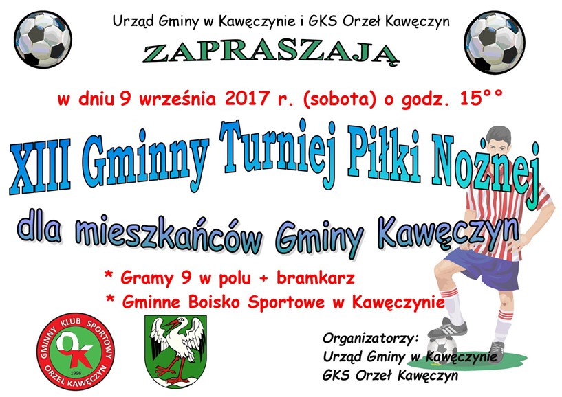 Urząd Gminy w Kawęczynie i GKS Orzeł Kawęczyn zapraszają na XIII Gminny Turniej Piłki Nożnej. Impreza odbędzie się 9 września. Początek rozgrywek zaplanowano na godz. 15:00. Piłkarze zmierzą się na murawie boiska gminnego w Kawęczynie. Organizatorzy zachęcają mieszkańców gminy Kawęczyn zarówno do gry, jak i kibicowania.