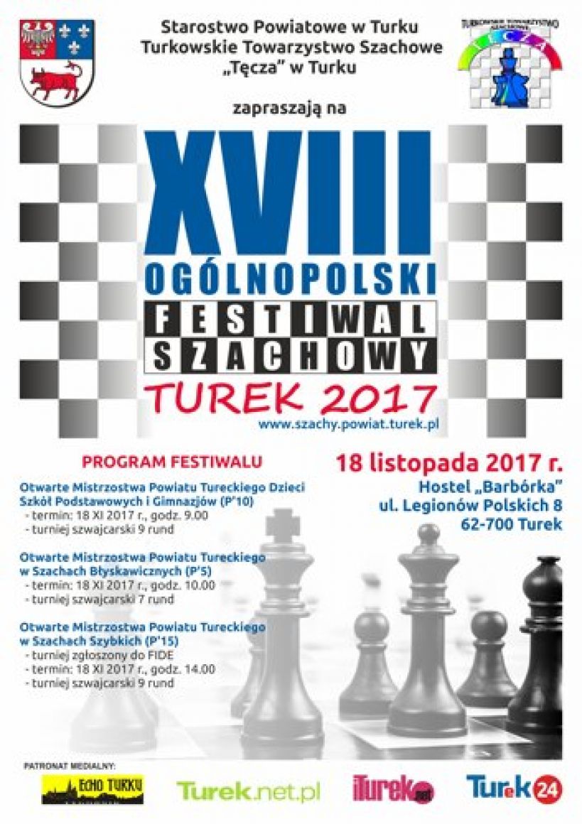 Zapraszamy do udziału w XVIII Ogólnopolskim Festiwalu Szachowym 2017, który odbędzie się 18 listopada br. w Hostelu Barbórka ul. Legionów Polskich 8 w Turku. Więcej informacji na załączonym plakacie.