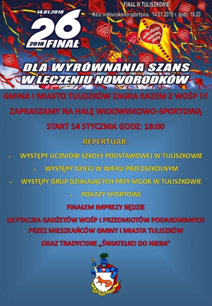 Gmina i Miasto Tuliszków zapraszają na 26. Finał Wielkiej Orkiestry Świątecznej Pomocy. Tym razem środki gromadzone będą na rzecz wyrównywania szans w leczeniu noworodków.