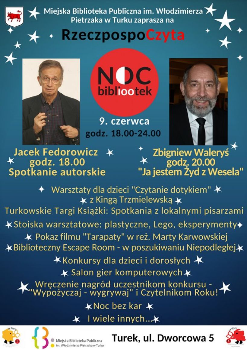 9 czerwca Miejska Biblioteka Publiczna im. Włodzimierza Pietrzaka w Turku przyłączy się, jak ponad 1700 bibliotek w całej Polsce, do wspaniałej akcji Noc Bibliotek, która w tym roku odbywa się pod hasłem „RzeczpospoCzyta”. Na tę wyjątkową noc zapewniamy szereg atrakcji dla wszystkich Czytelników, niezależnie od wieku – spotkania, warsztaty , konkursy, Biblioteczny Escape Room, Turkowskie Targi Książki… to tylko nieliczne z atrakcji!
