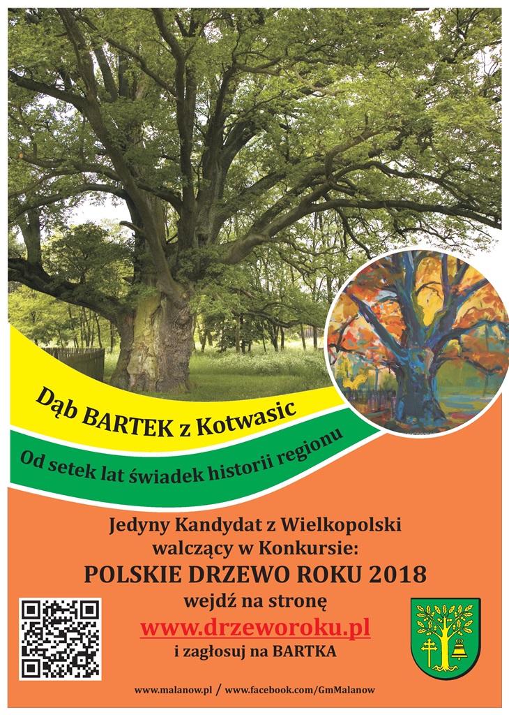 Do 30 czerwca 2018 r. można oddawać głosy w konkursie organizowanym przez Klub Gaja „Drzewo Roku 2018”. Wśród 16 finalistów znalazł się również Dąb Bartek z Kotwasic – duma i symbol gminy Malanów. To naprawdę niepowtarzalna okazja, by o naszym drzewie usłyszała cała Polska. Druga taka szansa może się nie powtórzyć. Zachęcamy wszystkich do wzięcia udziału w głosowaniu i oddawania głosów na naszego Bartka. Głosowanie odbywa się poprzez stronę www.drzeworoku.pl.
