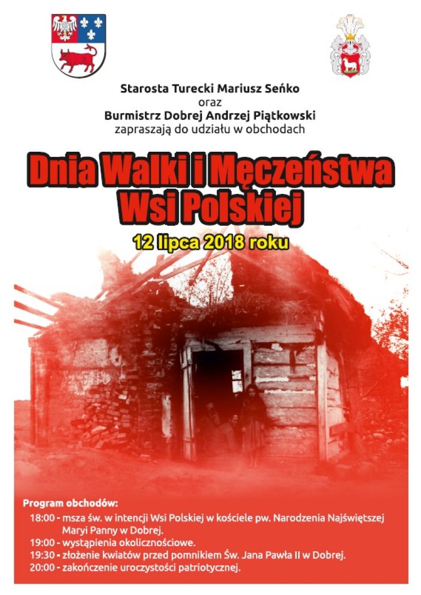 Starosta turecki – Mariusz Seńko oraz burmistrz Dobrej – Andrzej Piątkowski zapraszają do udziału w obchodach Dnia Walki i Męczeństwa Wsi Polskiej, które odbędą się w czwartek 12 lipca w Dobrej. Uczestnicy wydarzenia spotkają się o godz. 18:00 w kościele pw. Narodzenia Najświętszej Maryi Panny w Dobrej, gdzie odprawiona zostanie msza święta w inwencji Wsi Polskiej. Po modlitwie przyjdzie czas na okolicznościowe wystąpienia. Zgromadzeni złożą także kwiaty pod pomnikiem św. Jana Pawła II.