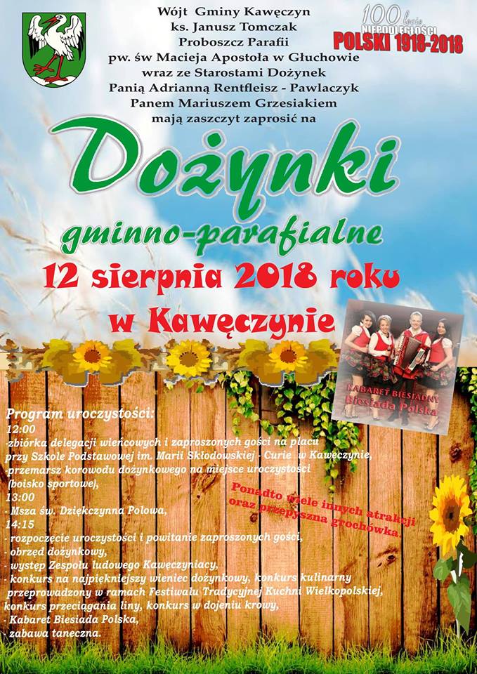 Wszystkich rolników i innych mieszkańców gminy do wspólnego świętowania zapraszają wójt Jan Nowak, proboszcz parafii pw. świętego Macieja Apostoła w Głuchowie – ksiądz Janusz Tomczak, a także starostowie dożynkowi – Adrianna Rentfleisz-Pawlaczyk i Mariusz Grzesiak. Oprócz ceremoniału dożynkowego zorganizowany zostanie także konkurs kulinarny, przeprowadzony w ramach Festiwalu Tradycyjnej Kuchni Wielkopolskiej. Wydarzenie uświetnią swoimi występami członkowie zespołu ludowego Kawęczyniacy i kabaretu Biesiada Polska. Szczegóły na plakacie.