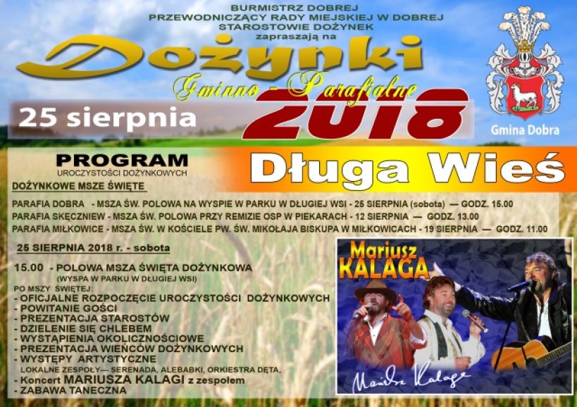 Uroczystości rozpocznie o godz. 15:00 polowa msza święta, odprawiona na wyspie w parku w Długiej Wsi. Tam też nastąpi powitanie gości, zaprezentowani zostaną również starostowie Dożynek. Nie zabraknie też występów artystycznych. Przed publicznością zaprezentuje się Orkiestra Dęta OSP Dobra-Żeronice, zaśpiewają zespoły Serenada i Alebabki. Gminno-Parafialne Dożynki w Długiej Wsi zakończy wieczorna zabawa taneczna.