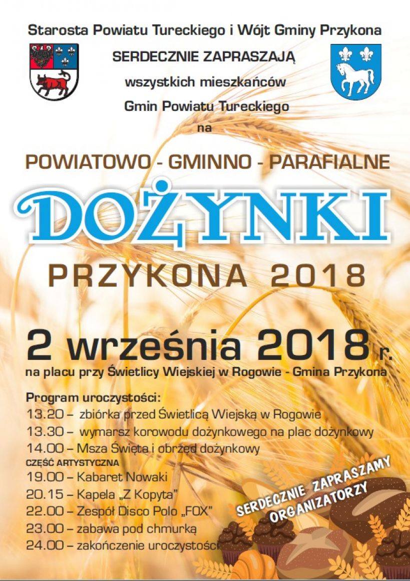 Starosta Powiatu Tureckiego i Wójt Gminy Przykona zapraszają na Powiatowo-Gminno-Parafialne Dożynki, które odbędą się w niedzielę 2 września w Rogowie. Wydarzenie uświetnią występy kabaretu Nowaki, Kapeli „Z Kopyta” i grupy disco-polo FOX.