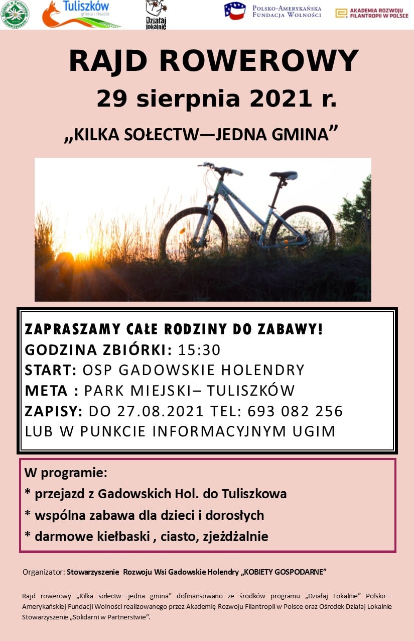 w niedzielę 29 sierpnia 2021 r. podczas Dożynek Gminno- Parafialnych odbędzie się finał rajdów rowerowych organizowanych w ramach projektu "Kilka Sołectw- Jedna Gmina".