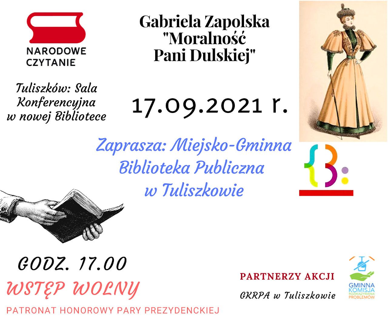 Zapraszamy do udziału w tuliszkowskiej odsłonie Narodowego Czytania. 17 września, o godz. 17.00, w Sali Konferencyjnej nowej Biblioteki mieszkańcy naszego miasta odczytają fragmenty komedii Gabrieli Zapolskiej. Przewidziano również słodki poczęstunek i inne niespodzianki dla naszych gości. Serdecznie zapraszamy! Wstęp wolny!