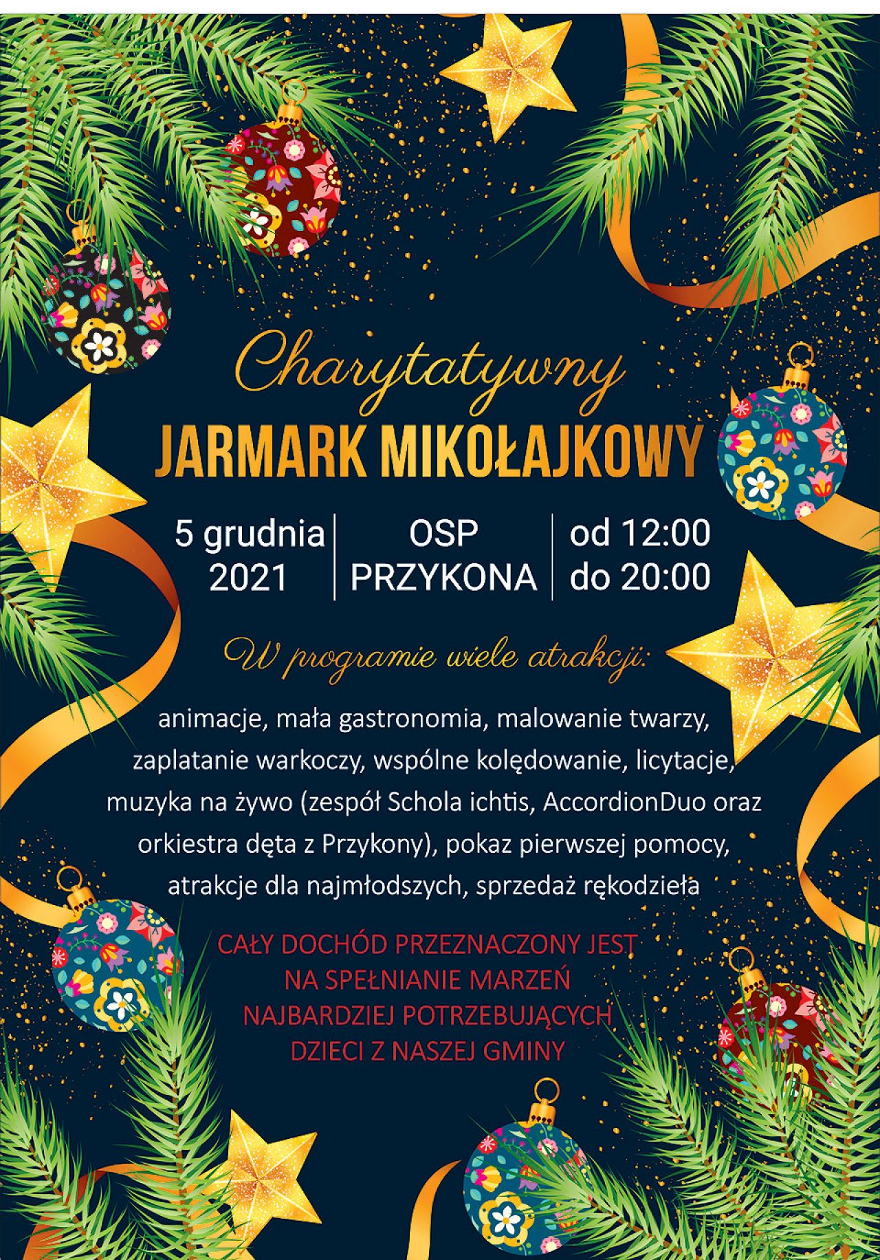 W dniu 05.12.2021 w godzinach 12-20.00 w OSP Przykona odbędzie się Charytatywny Kiermasz Bożonarodzeniowy organizowany przez koła gospodyń wiejskich przy pomocy sołtysów, radnych, mieszkańców i władz gminy.