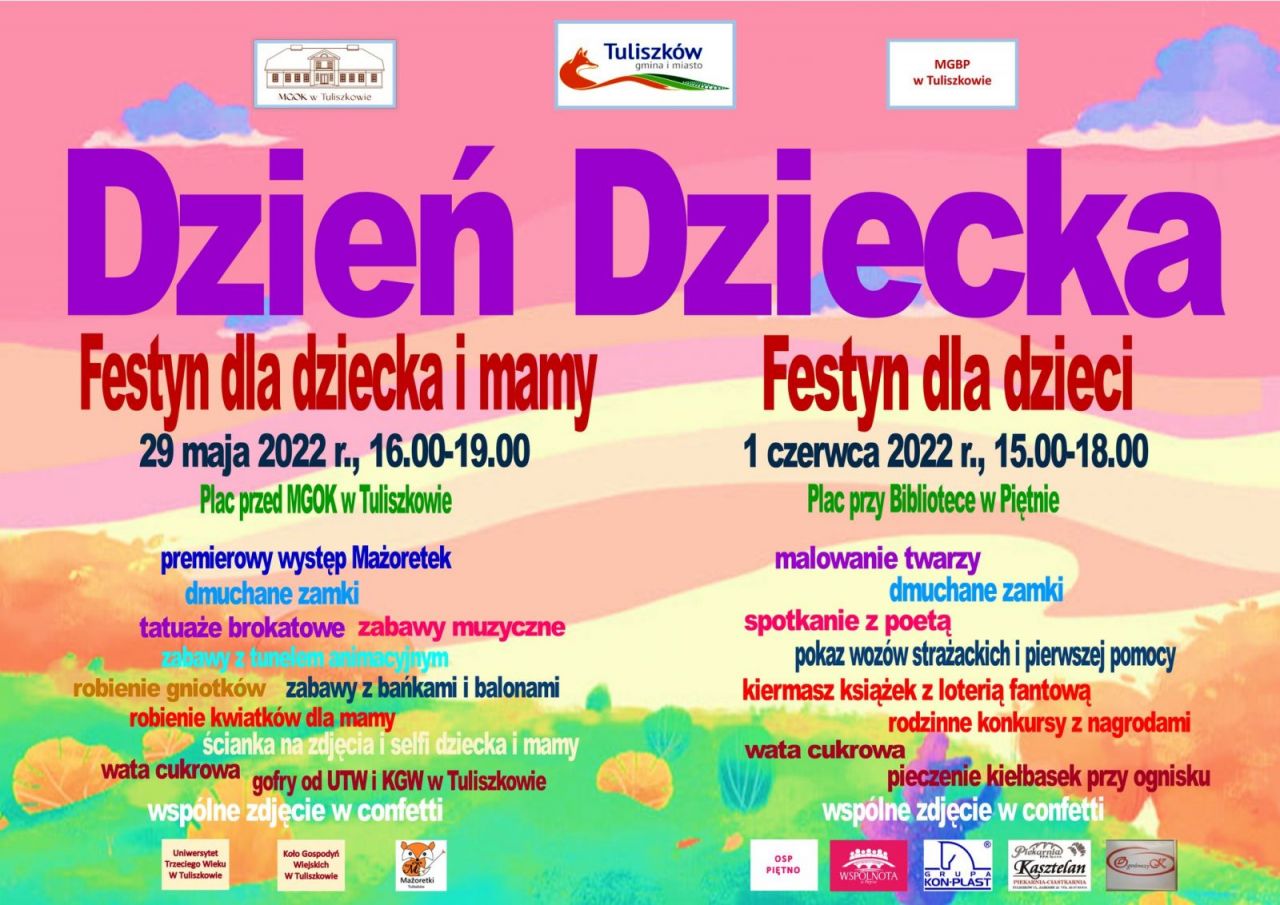 Zapraszamy na imprezy z okazji Dnia Dziecka organizowane przez Gminę i Miasto, MGOK i MGBP w Tuliszkowie, przy wsparciu różnych organizacji i sponsorów.