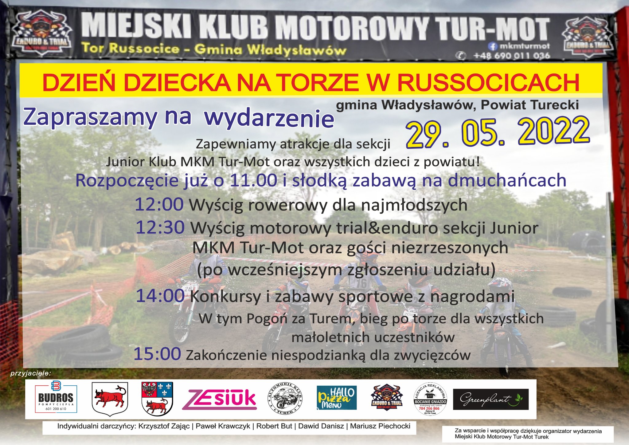 Już w najbliższy weekend 29.05.2022 zapraszamy na dzień dziecka organizowany przez MKM Tur-Mot Turek Enduro & Trial. Zapewniamy atrakcje dla sekcji Junior Klub MKM Tur-Mot oraz wszystkich dzieci z powiatu! Rozpoczęcie już o 11.00 i słodką zabawą na dmuchańcach