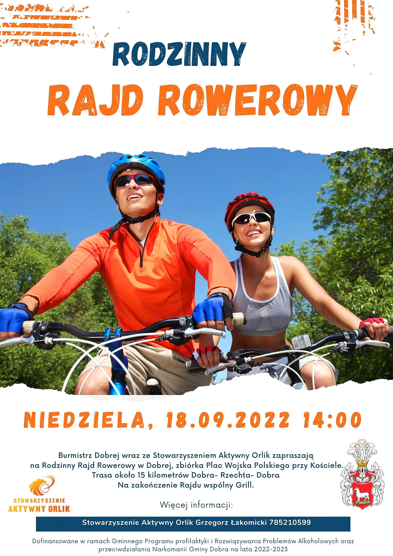 Burmistrz Dobrej oraz Stowarzyszenie Aktywny Orlik serdecznie zapraszaja do udziału w Rodzinnym Rajdzie Rowerowym, który odbędzie się w niedzielę, 18 września o godz. 14:00. Szczegóły na plakacie