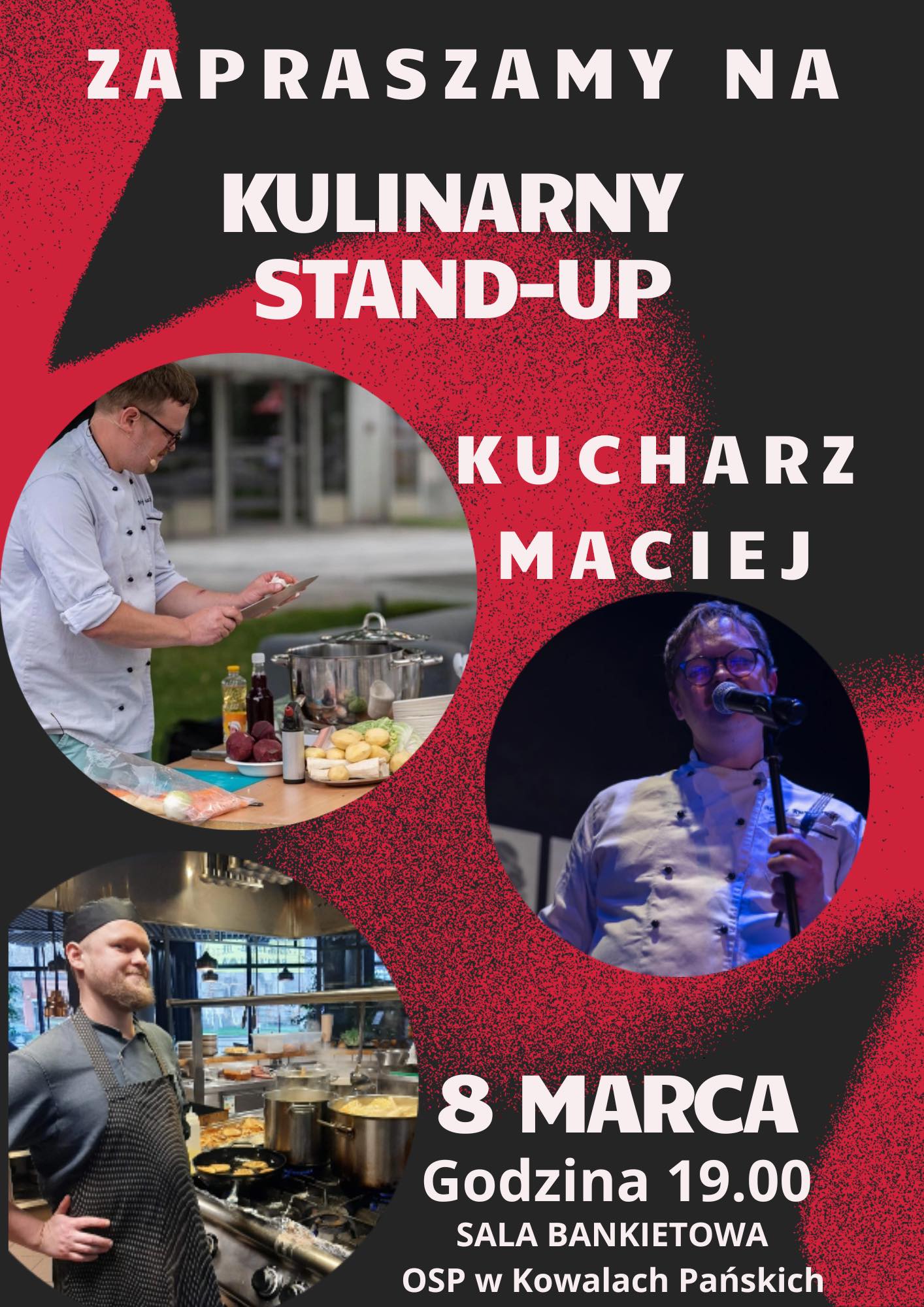 Jesteście gotowi na pierwszą w powiecie kulinarną dawkę humoru? Jeśli tak to 8 marca zapraszamy do Kowali Pańskich gdzie wystąpi dla Was najzabawniejszy kucharz w Polsce ! Kucharz Maciej swój występ Stand-Upowy łączy z gotowaniem na żywo, a więc poza dawką dobrej zabawy może akurat Ty zdegustujesz przygotowaną przez niego potrawę! ILOŚĆ MIEJSC OGRANICZONA