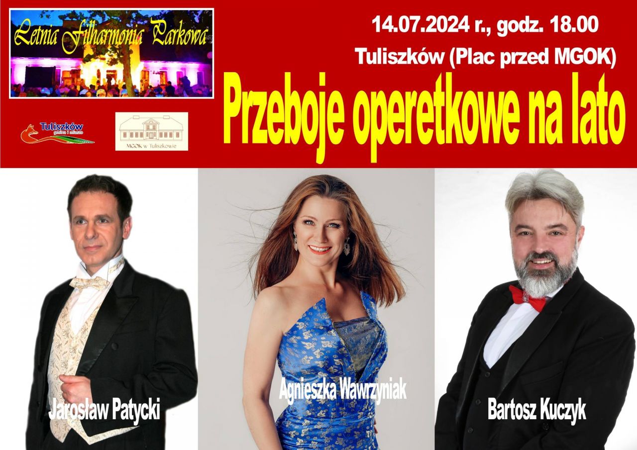 Już za dwa tygodnie, 14 lipca, o godzinie 18.00, na placu przed MGOK, pierwszy koncert w ramach naszej Letniej Filharmonii Parkowej. Przeboje operetkowe na lato zaśpiewają Agnieszka Wawrzyniak, Bartosz Kuczyk i Jarosław Patycki. Zapraszamy.