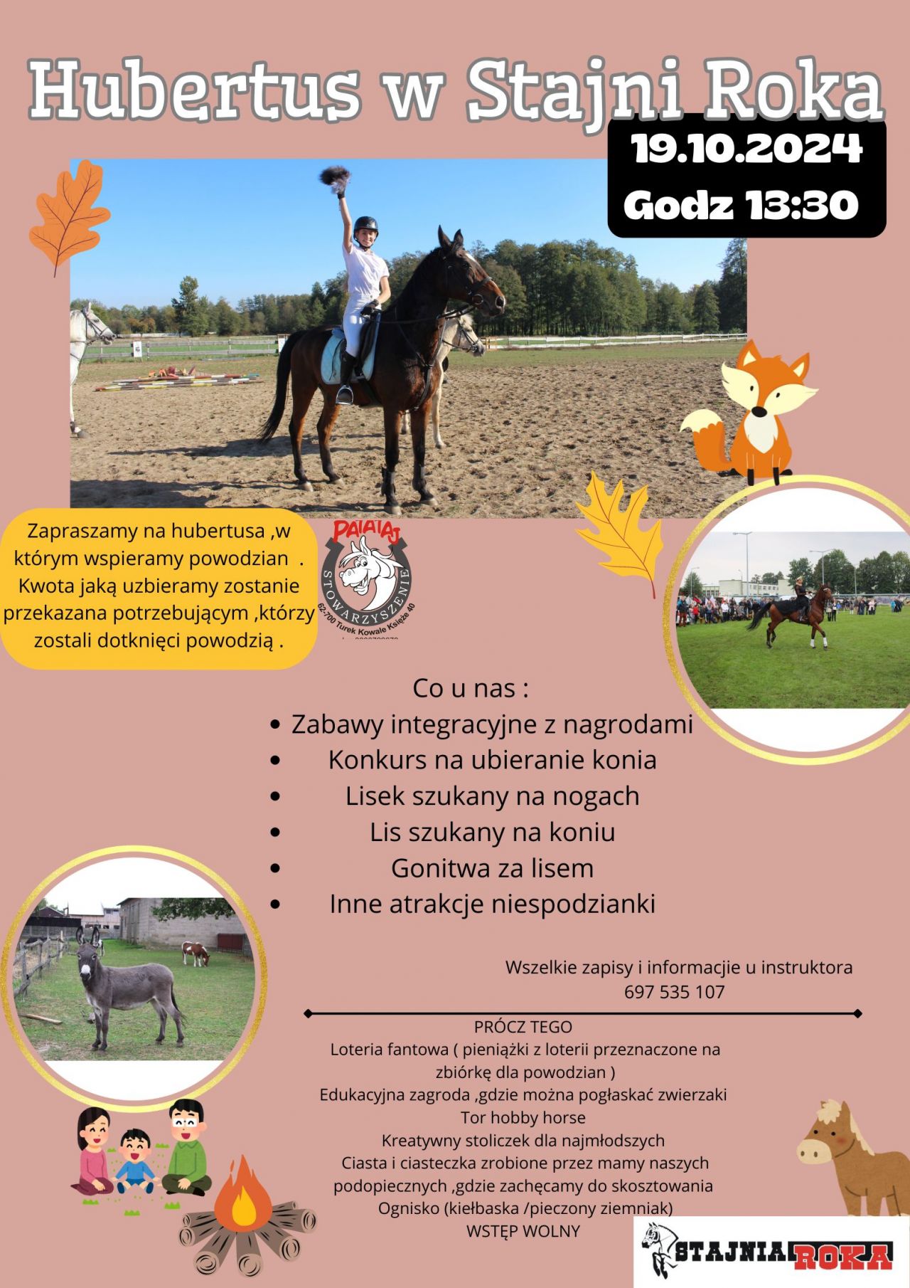 Hubertus w Stajni Roka odbędzie się 19 października 2024 roku o godzinie 13:30. Wydarzenie ma charakter charytatywny, a zebrane środki zostaną przeznaczone na pomoc osobom dotkniętym powodzią. W programie przewidziano wiele atrakcji, takich jak zabawy integracyjne z nagrodami, konkurs na ubieranie konia, poszukiwanie liska na nogach i koniu, a także gonitwa za lisem. Oprócz tego na uczestników czekają dodatkowe niespodzianki, loteria fantowa, edukacyjna zagroda ze zwierzętami, tor hobby horse, kreatywne stoliki dla najmłodszych oraz ognisko z kiełbaskami i pieczonymi ziemniakami. Wstęp jest wolny!