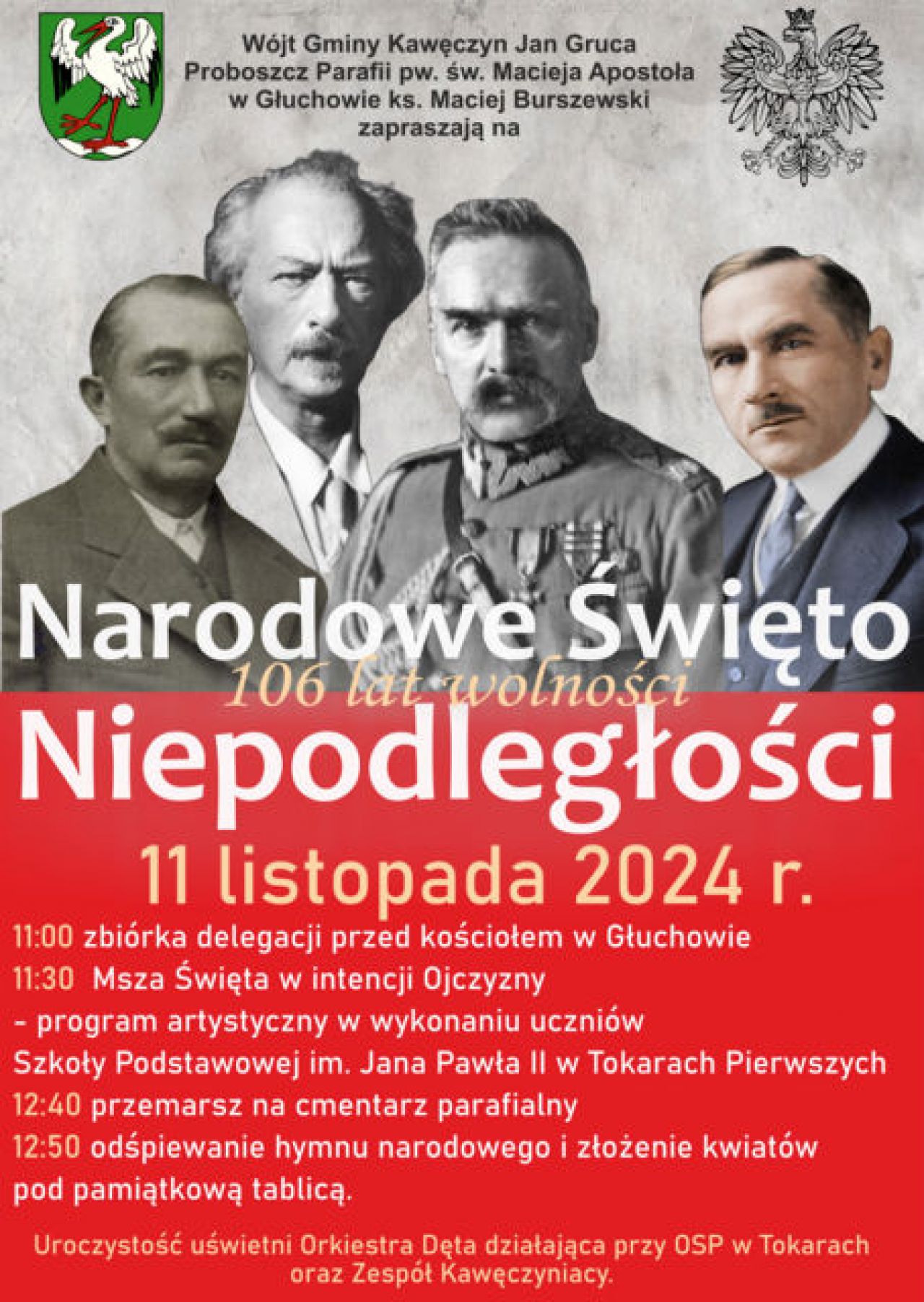 Wójt Gminy Kałwęczyn, Jan Gruca, oraz proboszcz parafii w Głuchowie, ks. Maciej Burszewski, zapraszają na obchody 106. rocznicy odzyskania niepodległości. 11 listopada 2024 roku o godzinie 11:00 odbędzie się zbiórka delegacji przed kościołem w Głuchowie, a o 11:30 Msza Święta w intencji Ojczyzny. Następnie program artystyczny w wykonaniu uczniów Szkoły Podstawowej im. Jana Pawła II w Tokarach Pierwszych, przemarsz na cmentarz parafialny oraz śpiewanie hymnu narodowego i złożenie kwiatów przy pomniku. Uroczystość uświetni Orkiestra Dęta działająca przy OSP w Tokarach oraz Zespół Kawęczyniacy.