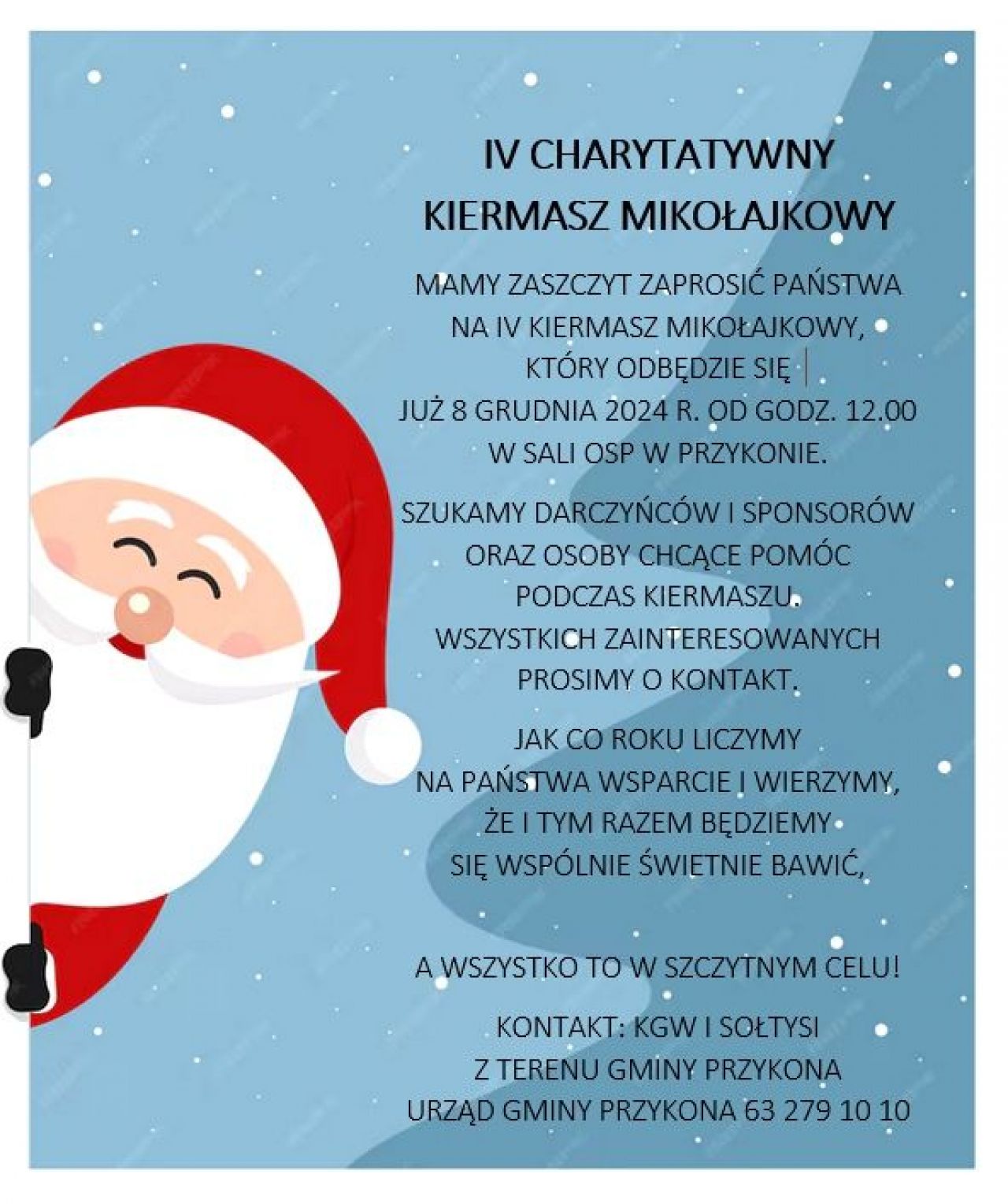 Zapraszamy na IV Charytatywny Kiermasz Mikołajkowy, który odbędzie się 8 grudnia 2024 roku o godzinie 12:00 w sali OSP w Przykonie. Poszukujemy darczyńców i sponsorów, a także osób chętnych pomóc podczas kiermaszu. Jak co roku liczymy na Państwa wsparcie i wierzymy, że wspólnie będziemy się świetnie bawić, pomagając w szczytnym celu. Wszystkich zainteresowanych prosimy o kontakt z KGW i Sołtysami z terenu Gminy Przykonie lub Urzędem Gminy Przykonie (tel. 63 279 10 10).