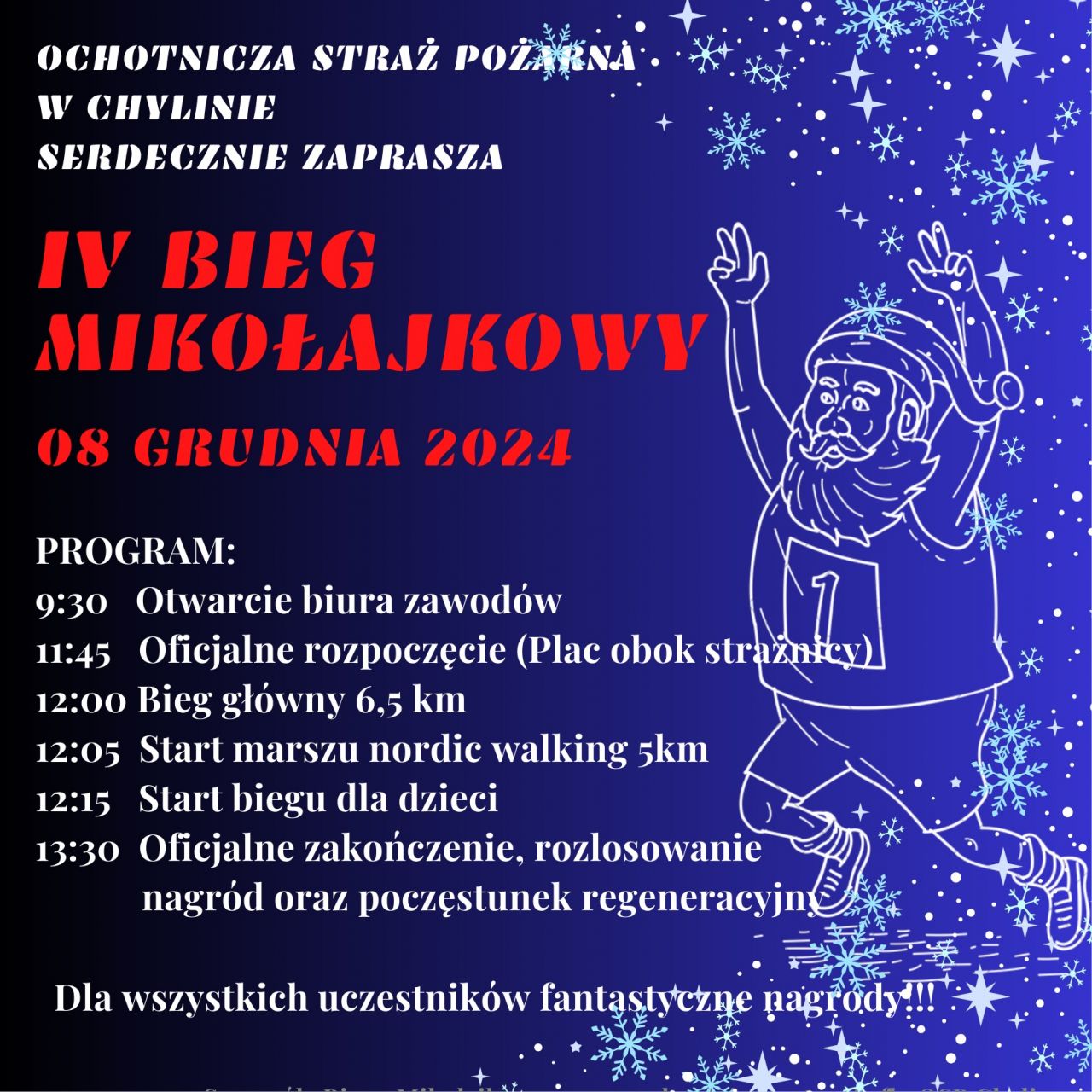 Hohoho!!! Dużymi krokami zbliżamy się do IV edycji BIEGU MIKOŁAJKOWEGO z OSP CHYLIN!!! Już teraz zapraszamy do zapisów!!! Ochotnicza Straż Pożarna w Chyline zaprasza na IV Bieg Mikołajkowy, który odbędzie się 8 grudnia 2024 roku. Program obejmuje otwarcie biura zawodów o godz. 9:30, oficjalne rozpoczęcie o godz. 11:45 (Plac obok strażnicy), bieg główny na dystansie 6,5 km o godz. 12:00, marsz nordic walking 5 km o godz. 12:05 oraz bieg dla dzieci o godz. 12:15. Oficjalne zakończenie, rozlosowanie nagród i poczęstunek regeneracyjny przewidziane są na godz. 13:30. Dla wszystkich uczestników czekają fantastyczne nagrody!
