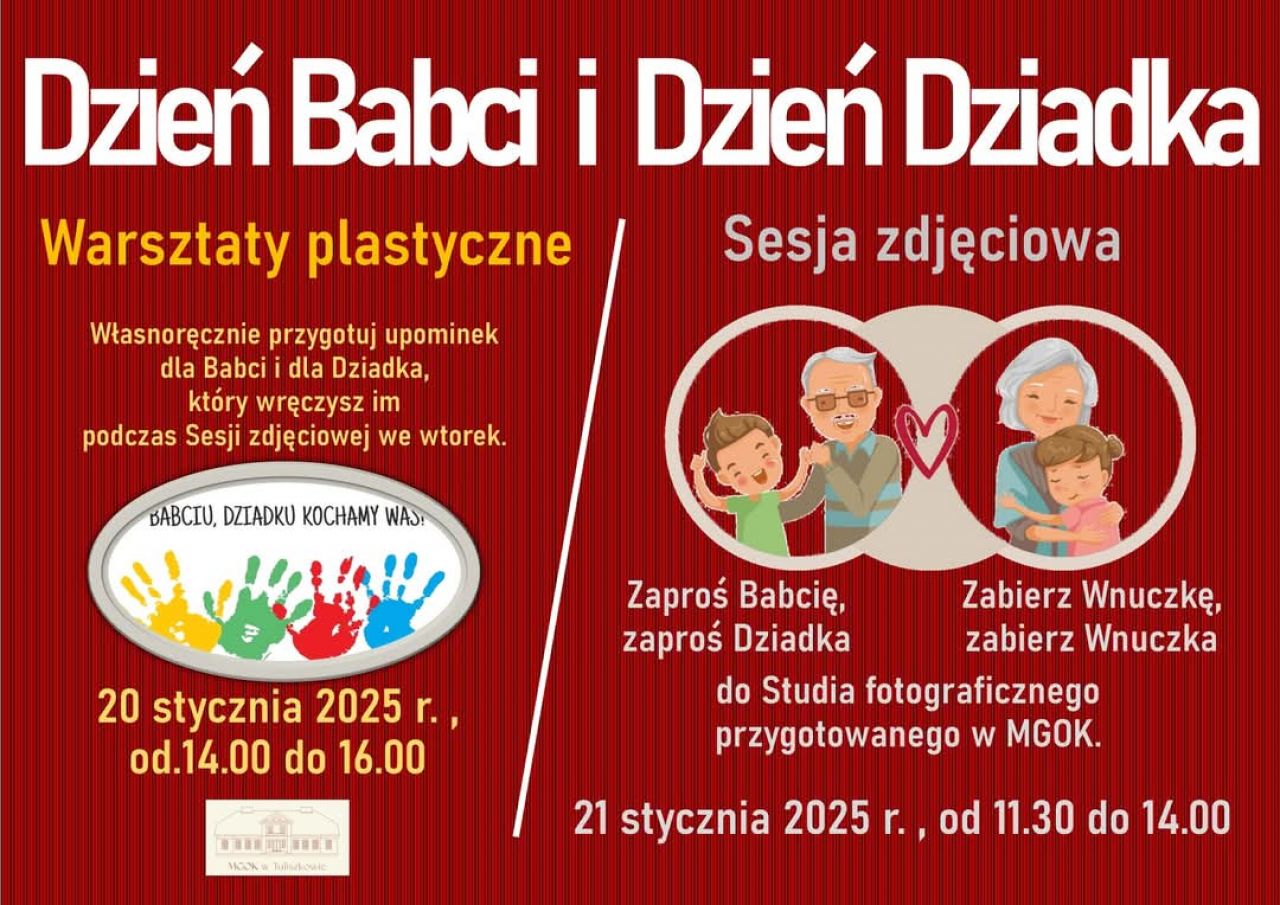 Zaproś Babcię, zaproś Dziadka, zabierz Wnuczkę, zabierz Wnuczka... Przyjdź do nas w poniedziałek 20 stycznia, a zrobisz własnoręcznie niespodziankę dla Babci i Dziadka, która wręczysz im we wtorek, 21 stycznia. My to jeszcze uwiecznimy na fotografii! Wasze zdjęcia: wnucząt z dziadkami będą składały się na wystawę, którą zaprezentujemy 8 marca, podczas Dnia Kobiet i Mężczyzn ;-) Szczegóły na plakacie. Ruszajcie z nami w przygodę z okazji Dnia Babci i Dziadka!