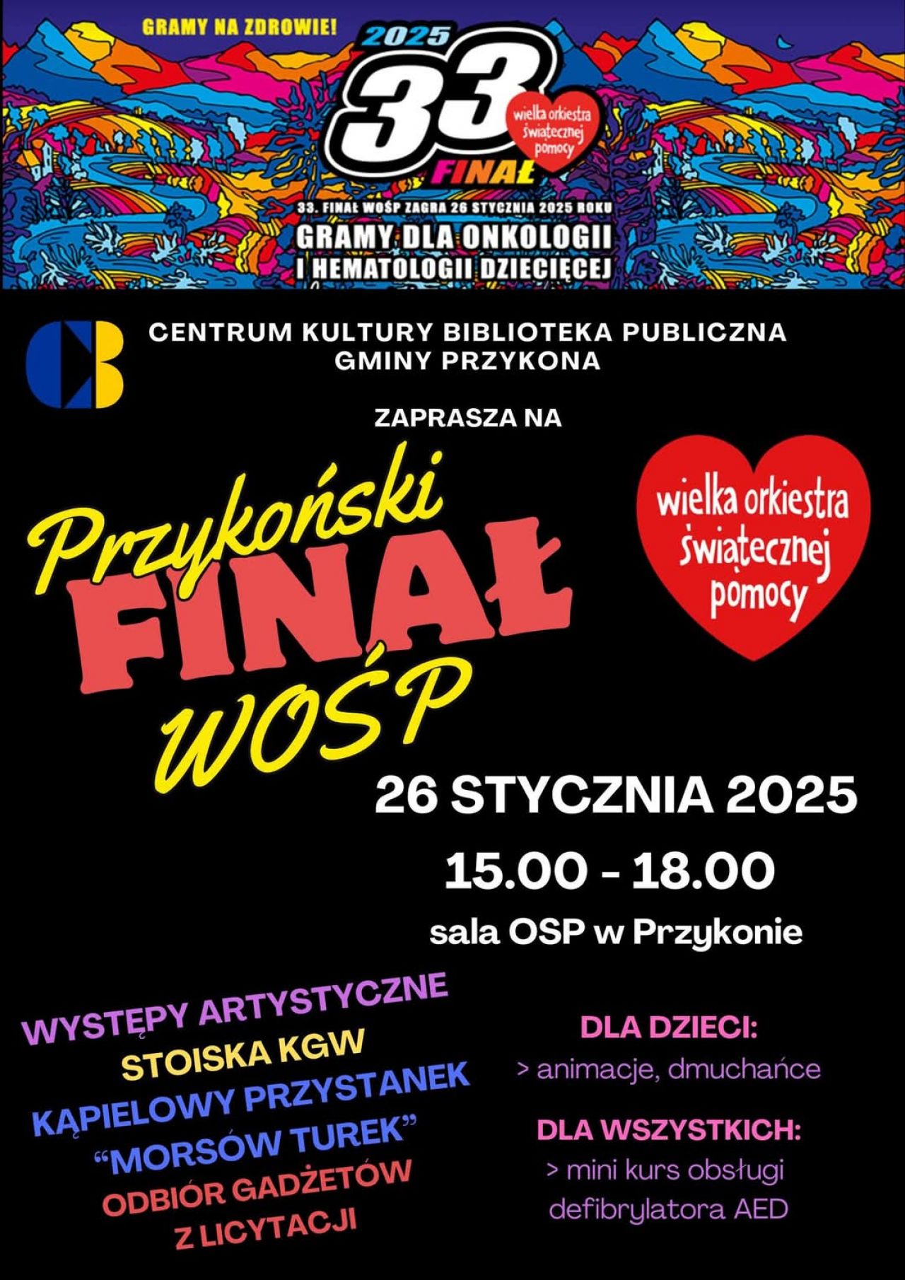 Już w najbliższą niedzielę odbędzie się 33. Finał WOŚP. Zapraszamy do sali OSP Przykona w godzinach 15.00 - 18.00, bo będzie się działo!