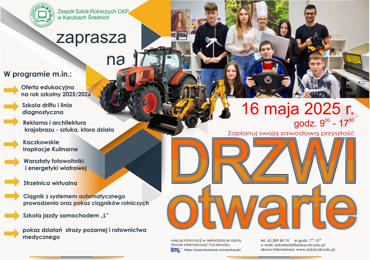 Zespół Szkół Rolniczych CKP w Kaczkach Średnich zaprasza na Drzwi Otwarte, które odbędą się 16 maja 2025 r. w godzinach 9:00 – 17:00. W programie zaplanowano ofertę edukacyjną na rok szkolny 2025/2026, prezentację szkoły drifty i linii diagnostycznej, reklamę i architekturę krajobrazu, Kaczkowskie Inspiracje Kulinarne, warsztaty fotowoltaiki i energetyki wiatrowej, strzelnicę wirtualną, pokaz ciągników rolniczych z systemem automatycznego prowadzenia, szkołę jazdy samochodowej „L”, pokaz działań straży pożarnej i ratownictwa medycznego oraz wiele innych atrakcji. Więcej informacji można uzyskać w sekretariacie szkoły lub na stronie internetowej.
