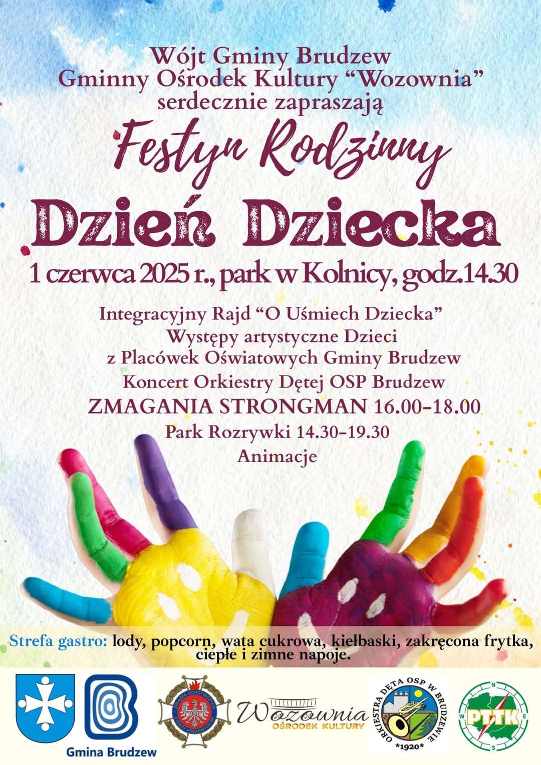 Festyn Rodzinny – Dzień Dziecka – Wójt Gminy Brudzew oraz Gminny Ośrodek Kultury „Wozownia” serdecznie zapraszają 1 czerwca 2025 r. o godzinie 14.30 do parku w Kolnicy na Integracyjny Rajd „O Uśmiech Dziecka”, występy artystyczne dzieci z placówek oświatowych Gminy Brudzew, koncert Orkiestry Dętej OSP Brudzew, zmagania strongman w godzinach 16.00–18.00, Park Rozrywki czynny od 14.30 do 19.30, nie zabraknie również animacji oraz strefy gastro z lodami, popcornem, watą cukrową, kiełbaskami, zakręconą frytką i napojami.