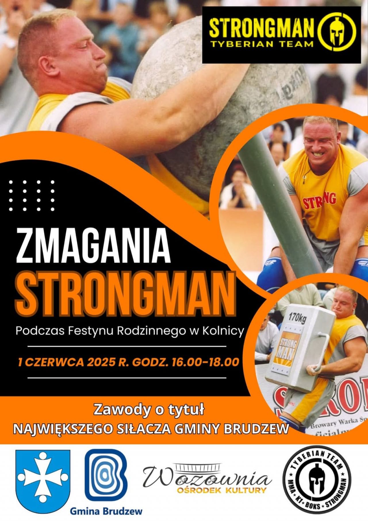 Zmagania Strongman – podczas Festynu Rodzinnego w Kolnicy zapraszamy 1 czerwca 2025 r. w godzinach 16.00–18.00 do udziału w zawodach o tytuł Największego Siłacza Gminy Brudzew, organizowanych przez Strongman Tyberian Team, Gminę Brudzew oraz Gminny Ośrodek Kultury „Wozownia”.