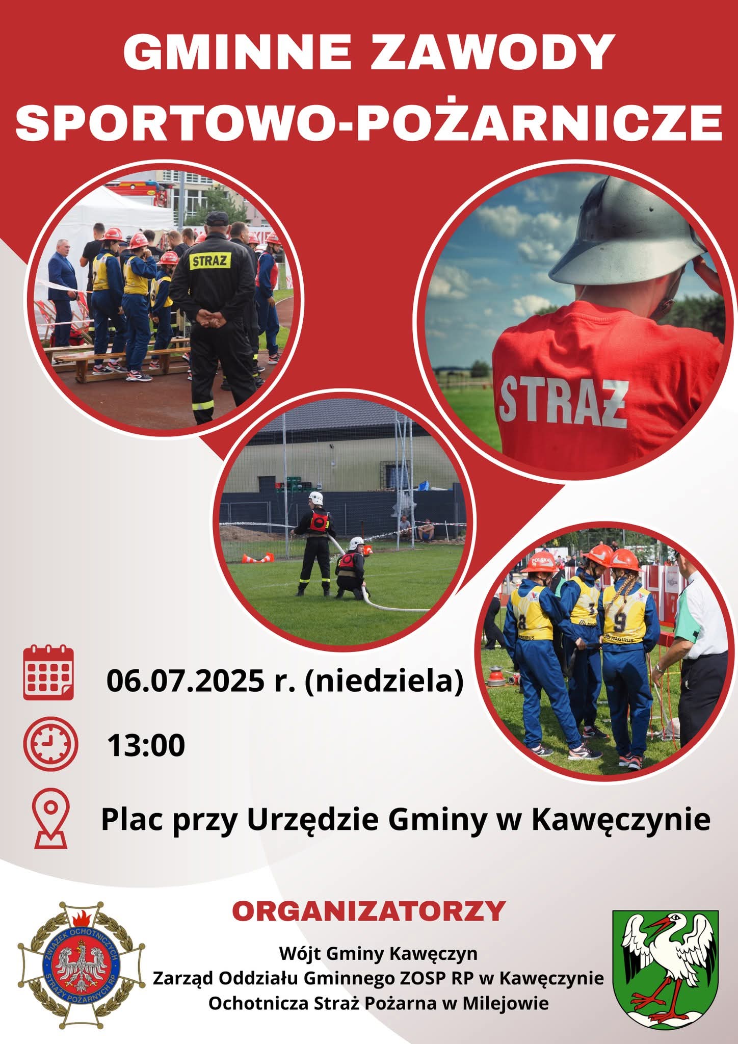 Gminne Zawody Sportowo-Pożarnicze odbędą się 6 lipca 2025 roku (niedziela) o godzinie 13:00 na placu przy Urzędzie Gminy w Kawęczynie, a organizatorami wydarzenia są Wójt Gminy Kawęczyn, Zarząd Oddziału Gminnego ZOSP RP w Kawęczynie oraz Ochotnicza Straż Pożarna w Milejowie.