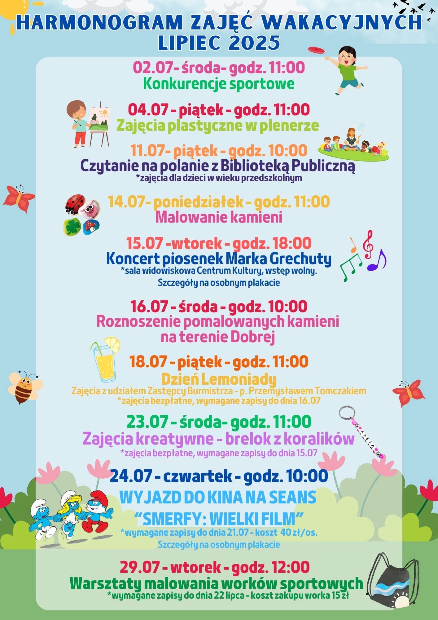 Centrum Kultury w Dobrej - Harmonogram Zajęć Wakacyjnych – Lipiec 2025 obejmuje następujące wydarzenia: 2 lipca (środa) o godzinie 11:00 odbędą się konkurencje sportowe, 4 lipca (piątek) o godzinie 11:00 zaplanowano zajęcia plastyczne w plenerze, 11 lipca (piątek) o godzinie 10:00 odbędzie się czytanie na polanie z Biblioteką Publiczną (dla dzieci w wieku przedszkolnym), 14 lipca (poniedziałek) o godzinie 11:00 zaplanowano malowanie kamieni, 15 lipca (wtorek) o godzinie 18:00 odbędzie się koncert piosenek Marka Grechuty w sali widowiskowej Centrum Kultury (wstęp wolny), 16 lipca (środa) o godzinie 10:00 uczestnicy będą roznosić pomalowane kamienie na terenie Dobrej, 18 lipca (piątek) o godzinie 11:00 odbędzie się Dzień Lemoniady z udziałem Zastępcy Burmistrza – Przemysława Tomczaka (zajęcia bezpłatne, wymagane zapisy do 16.07), 23 lipca (środa) o godzinie 11:00 zaplanowano zajęcia kreatywne – brelok z koralików (zajęcia bezpłatne, wymagane zapisy do 15.07), 24 lipca (czwartek) o godzinie 10:00 zaplanowano wyjazd do kina na seans „Smerfy: Wielki film” (koszt 40 zł/os., zapisy do 21.07), a 29 lipca (wtorek) o godzinie 12:00 odbędą się warsztaty malowania worków sportowych (zapisy do 22.07, koszt zakupu worka 15 zł).