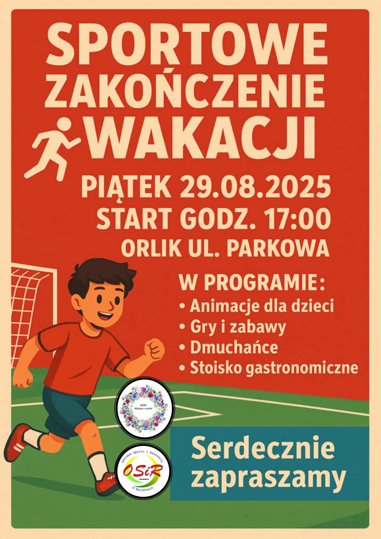Sportowe Zakończenie Wakacji odbędzie się w piątek 29 sierpnia 2025 roku o godz. 17:00 na Orliku przy ul. Parkowej, a w programie przewidziano animacje dla dzieci, gry i zabawy, dmuchańce oraz stoisko gastronomiczne.