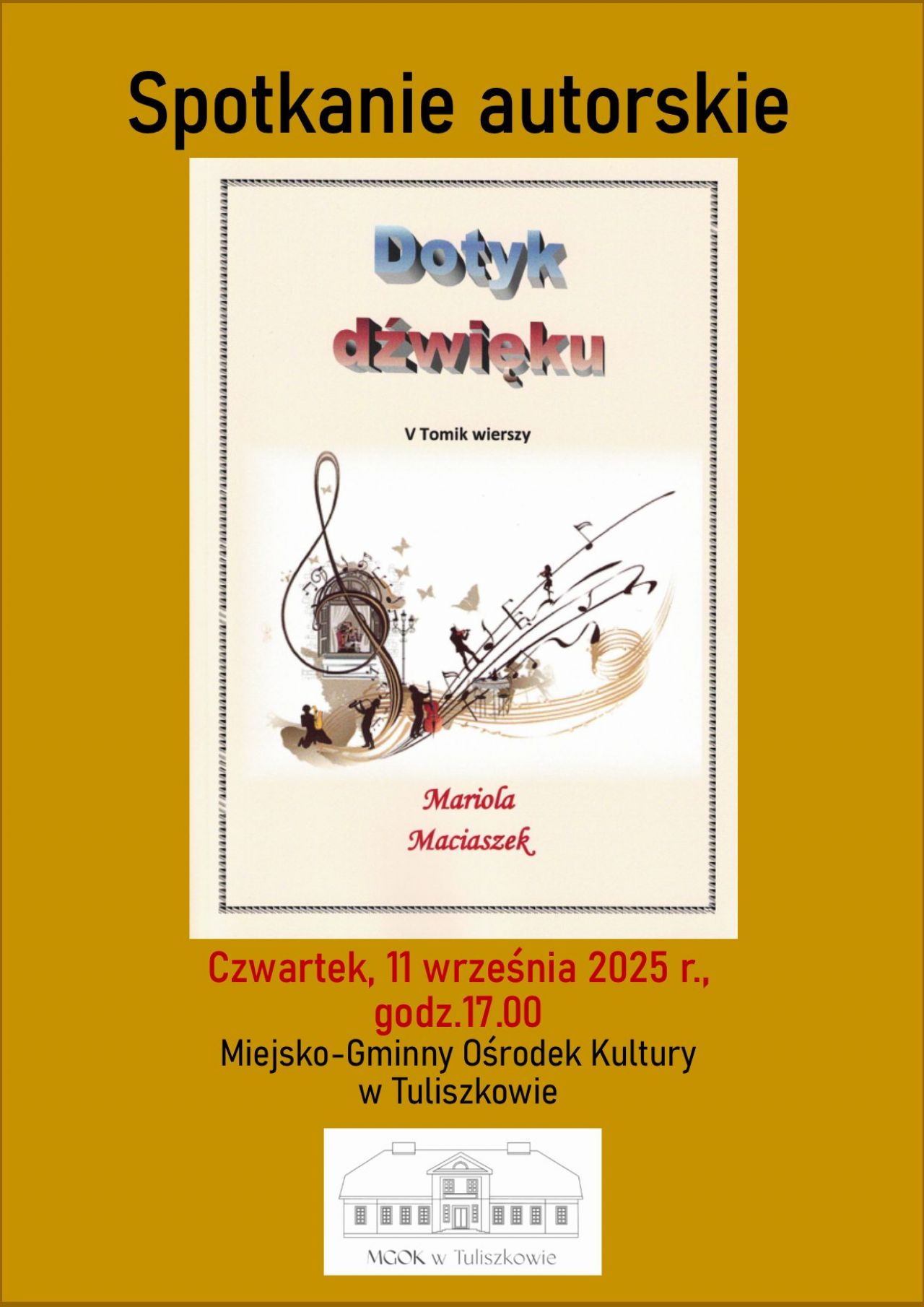 Spotkanie autorskie z Mariolą Maciaszek z okazji wydania piątego tomiku wierszy „Dotyk dźwięku” odbędzie się 11 września 2025 r. (czwartek) o godz. 17:00 w Miejsko-Gminnym Ośrodku Kultury w Tuliszkowie w Herbaciarni domu kultury.