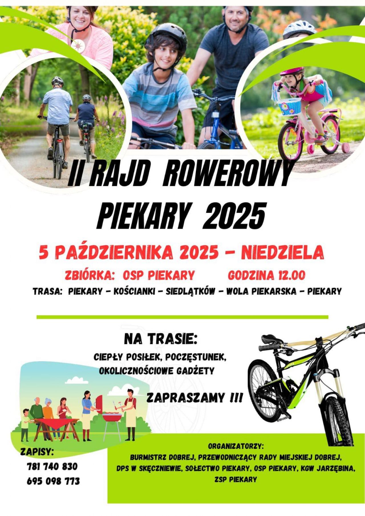 II Rajd Rowerowy Piekary 2025 odbędzie się 5 października 2025 r. (niedziela) o godz. 12:00, zbiórka przy OSP Piekary, a trasa przebiega przez Piekary – Kościanki – Siedlątków – Wolę Piekarską – Piekary; na uczestników czeka ciepły posiłek, poczęstunek oraz okolicznościowe gadżety, zapisy pod numerami 781 740 830 i 695 098 773, a organizatorami wydarzenia są Burmistrz Dobrej, Przewodniczący Rady Miejskiej Dobrej, DPS w Skęczniewie, Sołectwo Piekary, OSP Piekary, KGW Jarzębina oraz ZSP Piekary.