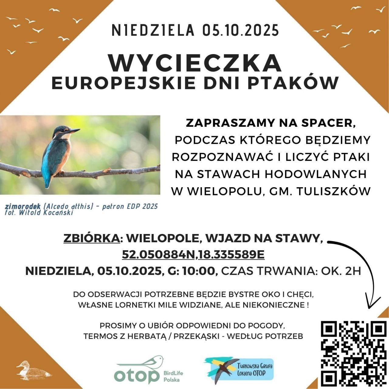 Wycieczka z okazji Europejskich Dni Ptaków odbędzie się w niedzielę 5 października 2025 r. o godz. 10:00 na stawach hodowlanych w Wielopolu, gm. Tuliszków. Zbiórka: Wielopole, wjazd na stawy (52.050884N, 18.335589E). Czas trwania spaceru to ok. 2 godziny, podczas których uczestnicy będą rozpoznawać i liczyć ptaki. Organizatorzy zachęcają do zabrania własnych lornetek, termosu z herbatą i przekąsek oraz ubrania dostosowanego do pogody. Wydarzenie organizuje Turkowska Grupa Lokalna OTOP.