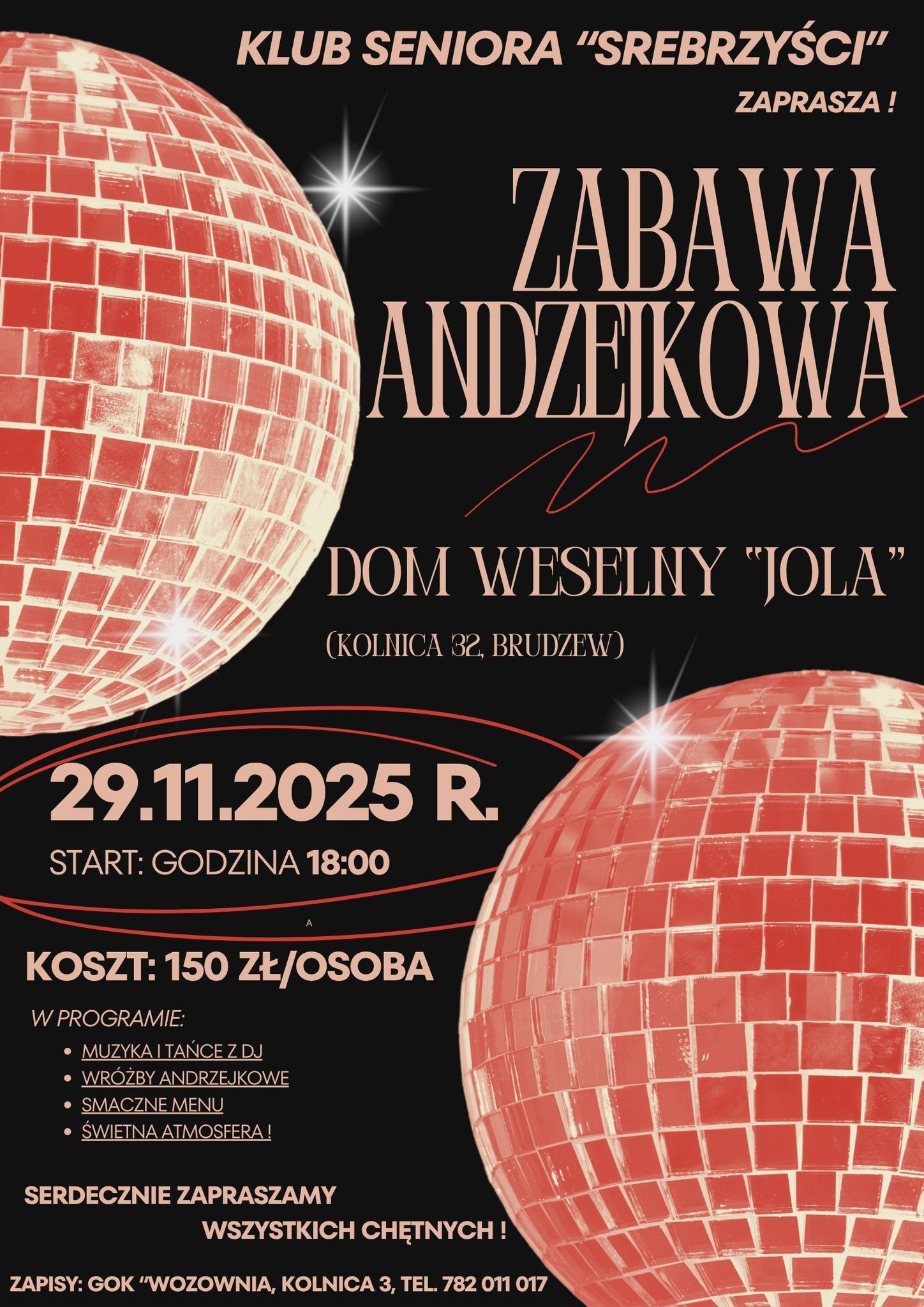 29 listopada 2025 roku o godz. 18:00 w Domu Weselnym „Jola” w Kolnicy 32 (Brudzew) odbędzie się Zabawa Andrzejkowa organizowana przez Klub Seniora „Srebrzyści”. W programie przewidziano muzykę i tańce z DJ-em, wróżby andrzejkowe, smaczne menu oraz doskonałą atmosferę. Koszt udziału wynosi 150 zł za osobę. Zapisy prowadzi GOK „Wozownia” w Kolnicy 3, tel. 782 011 017. Organizatorzy serdecznie zapraszają wszystkich chętnych do wspólnej zabawy i celebrowania andrzejkowego wieczoru.