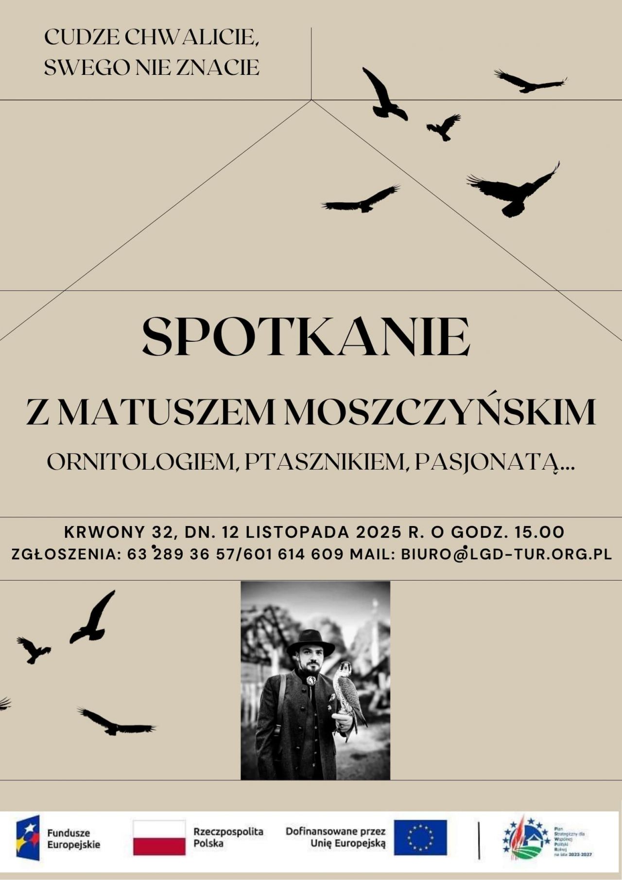 12 listopada 2025 roku o godz. 15:00 w siedzibie Turkowskiej Unii Rozwoju – T.U.R. w Krwonach 32 odbędzie się wyjątkowe spotkanie w ramach cyklu „Cudze chwalicie, swego nie znacie”. Gościem wydarzenia będzie Mateusz Moszczyński, znany ornitolog i miłośnik ptaków, który z pasją opowiada o swojej pracy, przyrodzie i niezwykłych relacjach człowieka ze światem zwierząt. Spotkanie adresowane jest do młodszych i starszych mieszkańców gmin: Brudzew, Dobra, Kawęczyn, Kościelec, Malanów, Przykona, Turek i Władysławów.. Zgłoszenia pod numerem 63 289 36 57, 601 614 609 lub mailowo: biuro@lgd-tur.org.pl.