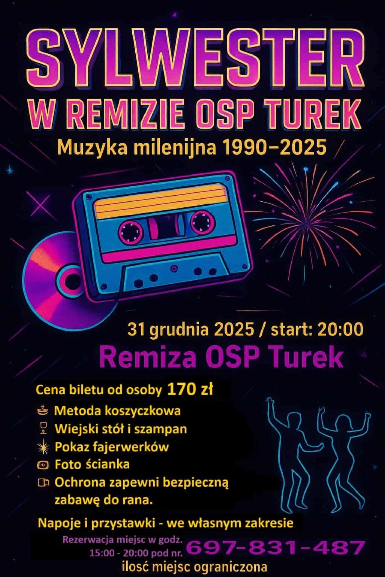 Sylwester w Remizie OSP Turek – Muzyka milenijna 1990–2025 – niezapomniana noc sylwestrowa już 31 grudnia 2025 roku od godziny 20:00 w Remizie OSP Turek. W programie: wiejski stół i szampan, pokaz fajerwerków, foto ścianka oraz zabawa do rana z pełnym zabezpieczeniem ochrony. Obowiązuje metoda koszyczkowa, napoje i przystawki we własnym zakresie. Cena biletu: 170 zł od osoby. Rezerwacja miejsc w godzinach 15:00–20:00 pod numerem telefonu 697-831-487. Liczba miejsc ograniczona – nie przegap sylwestrowej nocy pełnej muzyki, tańca i dobrej zabawy!