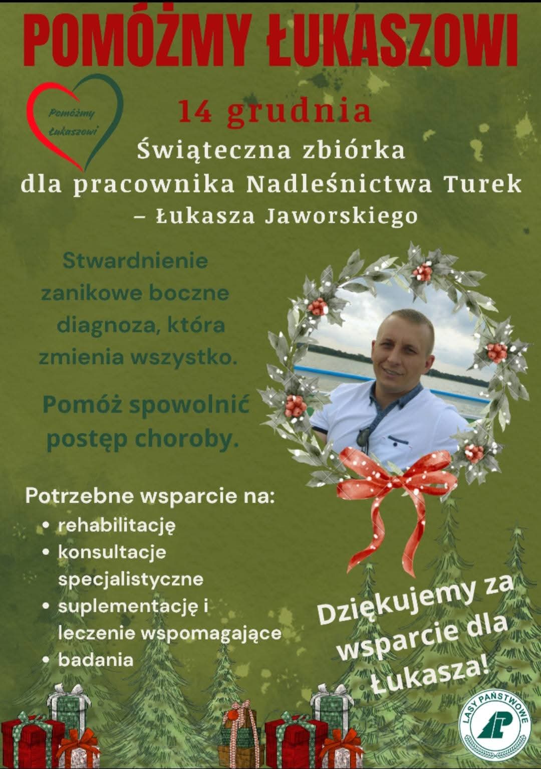 Pomóżmy Łukaszowi – świąteczna zbiórka podczas Jarmarku Bożonarodzeniowego odbędzie się 14 grudnia podczas wydarzeń towarzyszących Jarmarkowi Bożonarodzeniowemu 13–14 grudnia, a jej celem jest wsparcie leczenia i rehabilitacji Łukasza Jaworskiego, pracownika Nadleśnictwa Turek, który zmaga się ze stwardnieniem zanikowym bocznym – ciężką, postępującą chorobą neurodegeneracyjną; pomoc jest potrzebna na rehabilitację, konsultacje specjalistyczne, suplementację, leczenie wspomagające oraz badania, a wolontariusze mogą zgłaszać gotowość do kwestowania po mszach w Parafii NSPJ i Parafii św. Barbary, aby wspólnie wesprzeć Łukasza i spowolnić postęp choroby.