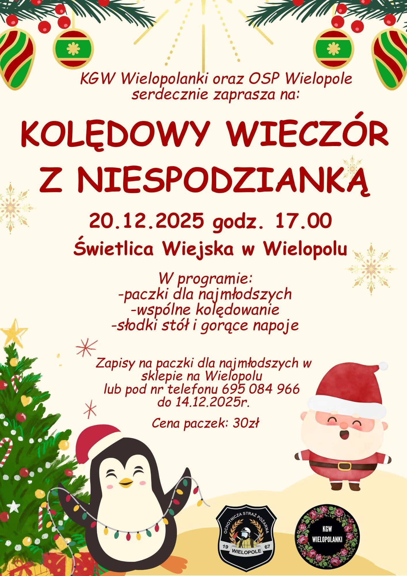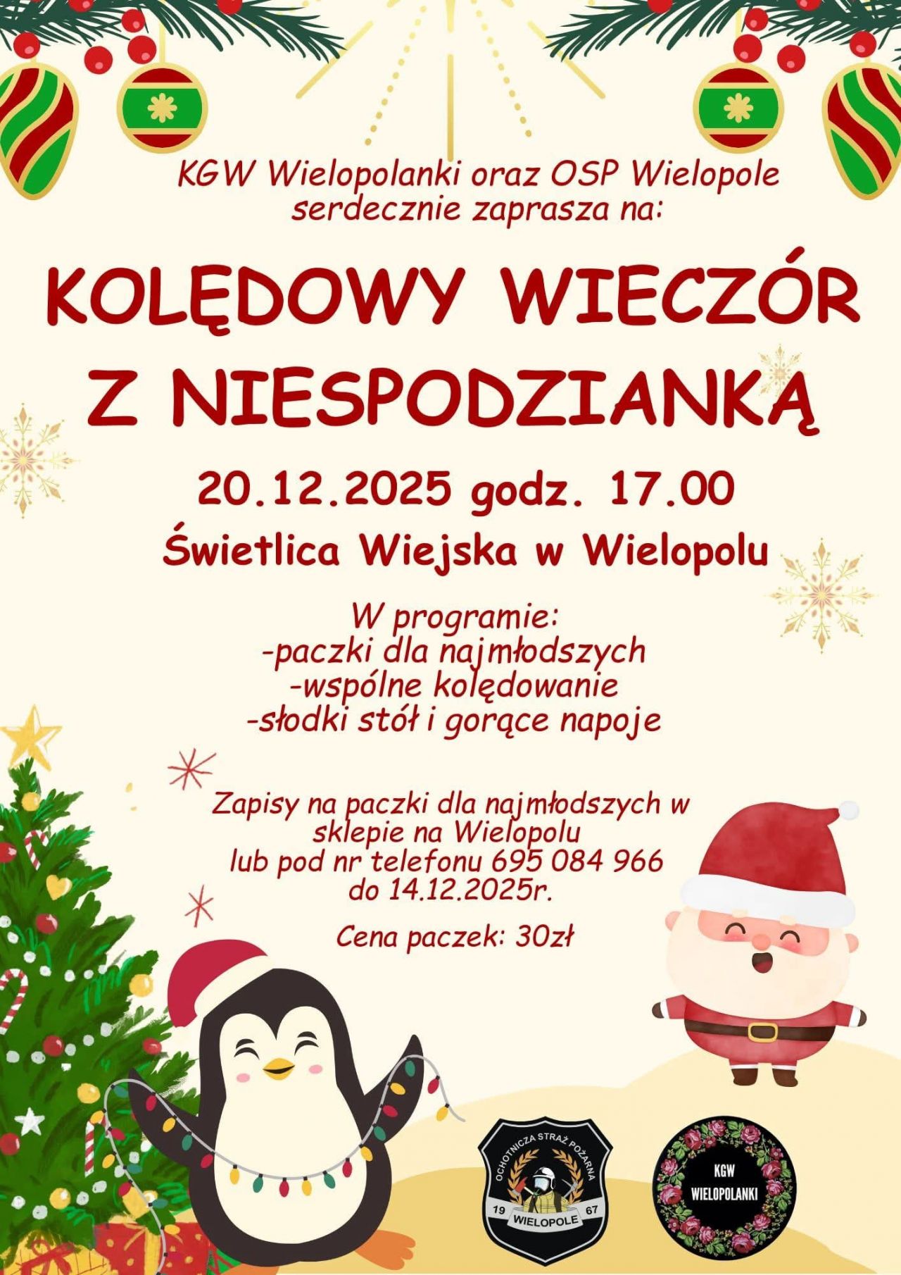 Kolędowy Wieczór z Niespodzianką odbędzie się 20.12.2025 o godz. 17:00 w Świetlicy Wiejskiej w Wielopolu, podczas którego przewidziano paczki dla najmłodszych, wspólne kolędowanie oraz słodki stół i gorące napoje, a zapisy na paczki prowadzone są w sklepie na Wielopolu lub telefonicznie do 14.12.2025 r., przy czym cena paczki wynosi 30 zł.