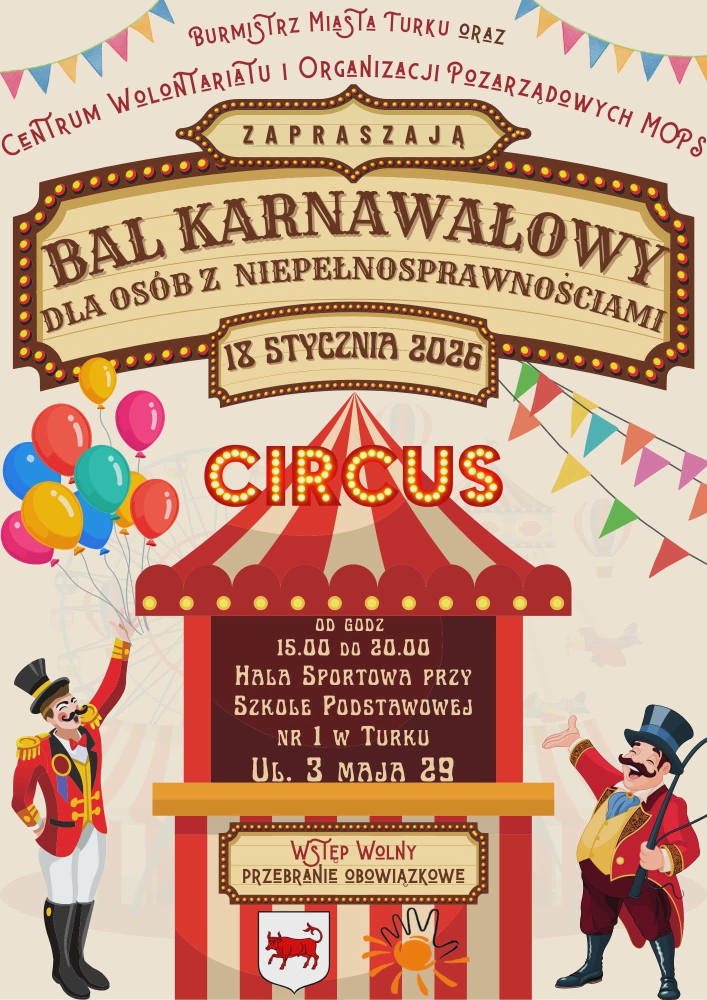 VIII Karnawałowy Bal dla Osób z Niepełnosprawnościami – CYRK odbędzie się 18 stycznia 2026 r. w godz. 15:00–20:00 w Hali Sportowej przy Szkole Podstawowej nr 1 im. Henryka Sienkiewicza w Turku przy ul. 3 Maja 29, gdzie na uczestników czeka radosna zabawa w cyrkowej atmosferze prowadzona przez DJ-a, wodzireja i animatora Marka Górskiego, przy wstępie wolnym i obowiązkowym przebraniu, gwarantując wspólne spotkanie pełne uśmiechu, muzyki i karnawałowego szaleństwa.